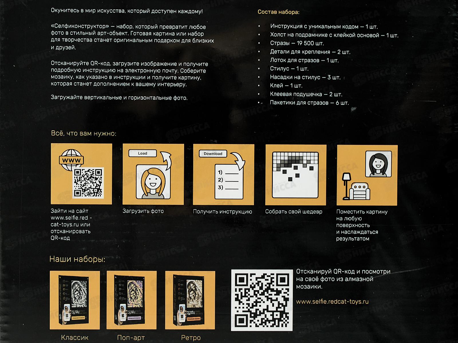 Особенность данной мозики в том, что вы можете выбрать любую картинку из интернета или же свою собственную фотографию. В комплект входит: инструкция с уникальным кодом - 1 шт, холст на подрамнике с клейкой основой - 1 шт, стразы - 19 500 шт, детали для крепления - 2 шт, лоток для страз - 1 шт, стилус - 2 шт, клей - 1 шт, пакетики для страз - 6 шт.