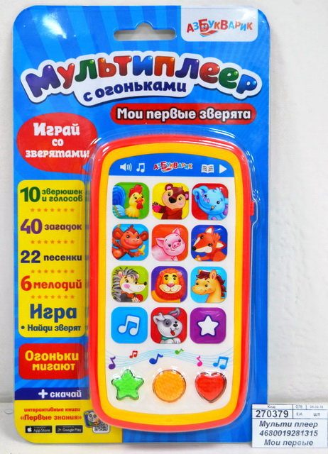 Интерактивный мультиплеер «Мои первые зверята» - это отличная игрушка для первого знакомства с миром животных. При нажатии на кнопочки с изображениями зверюшек можно послушать песенки о них и узнать, кто, как говорит. Для закрепления знаний в игрушке предусмотрены весёлые загадки и увлекательная игра «Найди зверят»! Также в мультиплеере с огоньками есть 28 зажигательных детских песенок и мелодий: «Как чудесно жить на свете», «Мишка косолапый», «Что такое лето», «Облака», «Валенки», «Два весёлых гуся» и другие. Во время звучания кнопочки мигают разноцветными огоньками – это так весело! Мультиплеер с огоньками «Мои первые зверята» порадует своим ярким дизайном: он похож на настоящий «взрослый» смартфон. С такой игрушкой малыш будет занят надолго! Мультиплеер способствует расширению кругозора и развивает музыкальный слух, память и мелкую моторику.