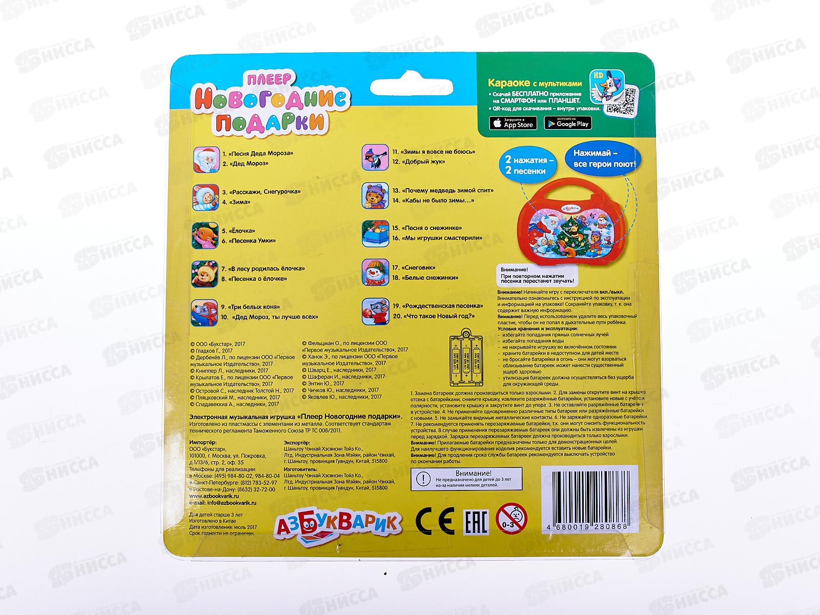 20 популярных новогодних песенок – в плеере оригинальной формы! Нажимай на Деда Мороза, Снегурочку и веселых зверят – каждый из героев споёт по 2 песенки («Расскажи, Снегурочка», «В лесу родилась ёлочка», «Три белых коня», «Почему медведь зимой спит» и др.). Малышам обязательно понравится всюду носить эту замечательную игушку с собой. Ещё больше песенок – в подарок от "Азбукварик"! Отсканируй QR-код на упаковке – скачай бесплатно книжку «Караоке» для смартфона или планшета.
