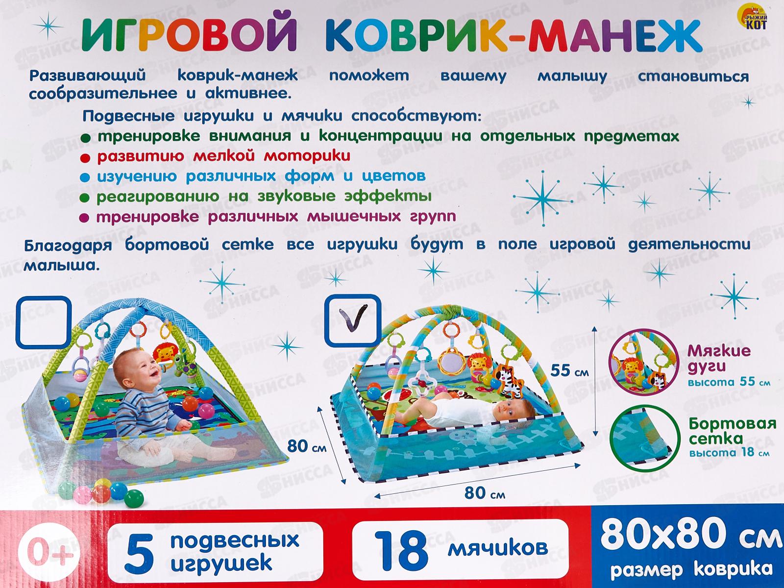 Выбирая ребенку игрушку, современные родители все чаще стремятся к тому, чтобы она была развивающей – так малыш не просто весело проведет время, но и научится чему-нибудь новому. И коврик подходит для этого как нельзя лучше. При этом он еще станет декоративным украшением любой детской комнаты. С помощью развивающего коврика ребенок быстрее научится фокусировать взгляд на предметах и следить за их перемещением, освоит хватательные движения, сможет развить мелкую моторику рук и координацию движений, распознавать форму и текстуру предметов и научиться различать цвета и оттенки. Игрушки идут в комплекте. В комплекте: 5 подвесных игрушек, 18 мячиков. Поверхность коврика легко чистится, а при необходимости его можно даже постирать. Размер: 80х80х55 см. В коробке.