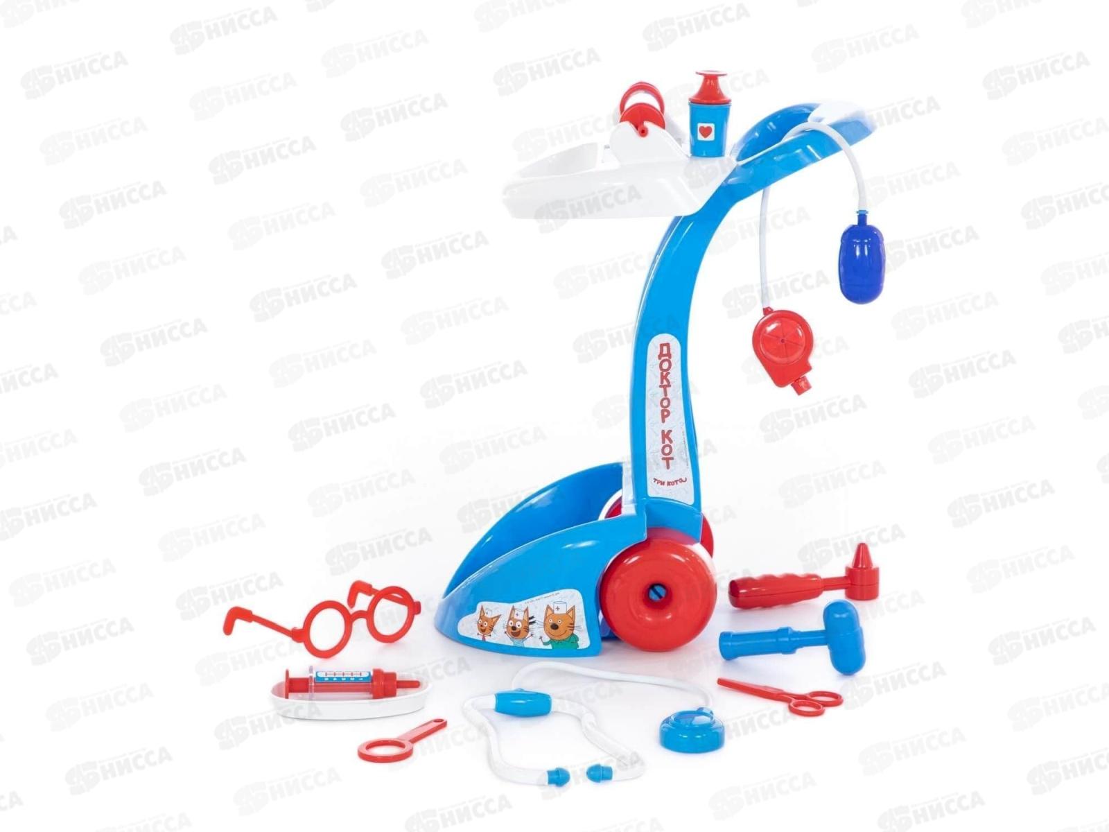 Игровой набор "Доктор Кот" представлен в виде игровой панели на тележке. Это как "скорая помощь", что позволяет оперативно помочь пациенту. На тележке удобно хранить и перемещать медицинские инструменты. Набор знакомит с профессией врача и с основными принадлежностями доктора. В игровой набор входят: ножницы, очки, лупа, шприц, лоток для инструментов, стетоскоп (для прослушивания сердца и лёгких), тонометр (для измерения давления), отоскоп (инструмент лор-врача), кардиограф, молоточек и баночка с крышкой. Набор украшен тематическими наклейками с изображением забавных персонажей мультсериала "Три кота".