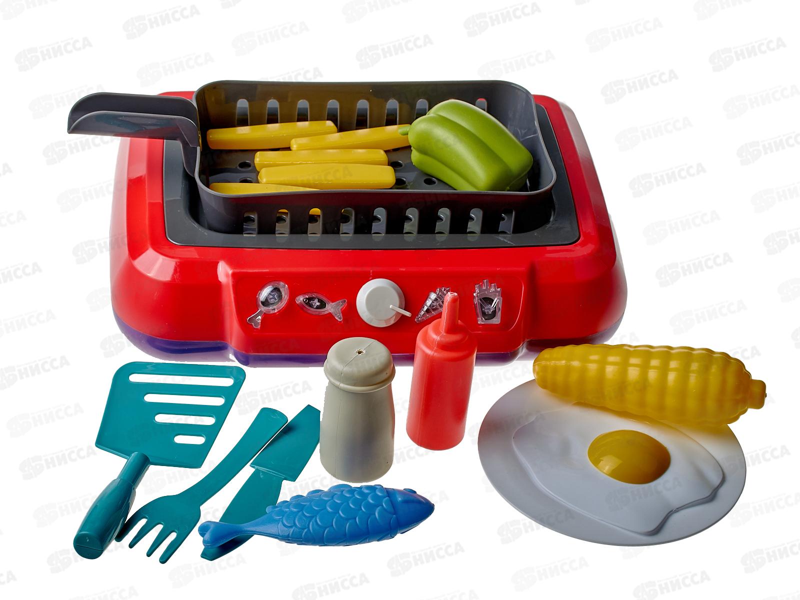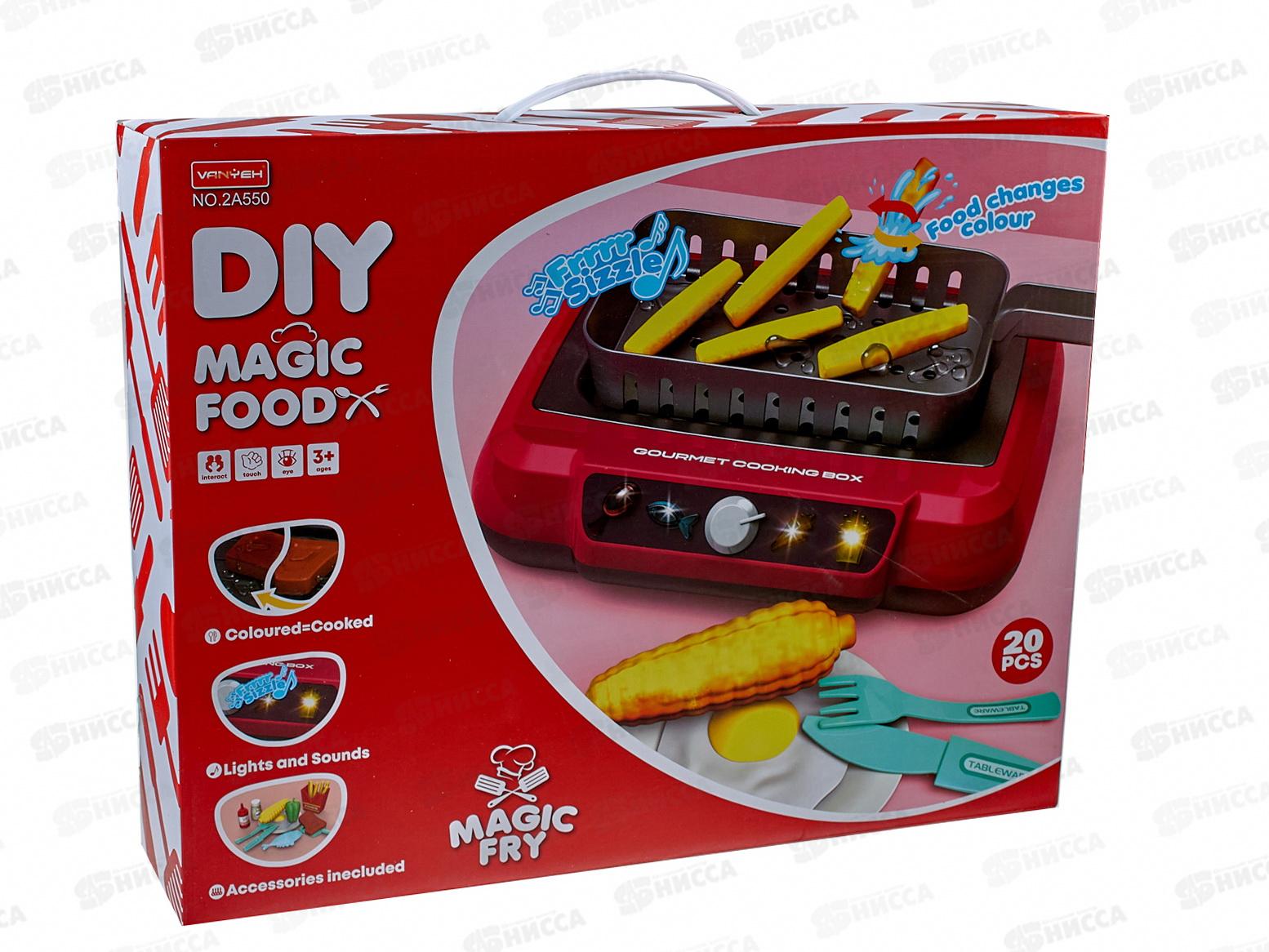 Играя, ребенок получит представления о том, как работает фритюрница – тот самый предмет, с помощью которого получается такая вкусная картошка фри. При включении фритюрница издает вибрирующие звуки. Кнопочки в виде продуктов светятся при нажатии (у каждой кнопки – свой цвет). В набор входят: фритюрница, лопатка, вилка, ложка, безопасный ножик, тарелка, кетчуп, солонка, сито, перец, стейк, кукуруза, рыбка, яичница, 5 ломтиков картошки фри и коробка для них.
