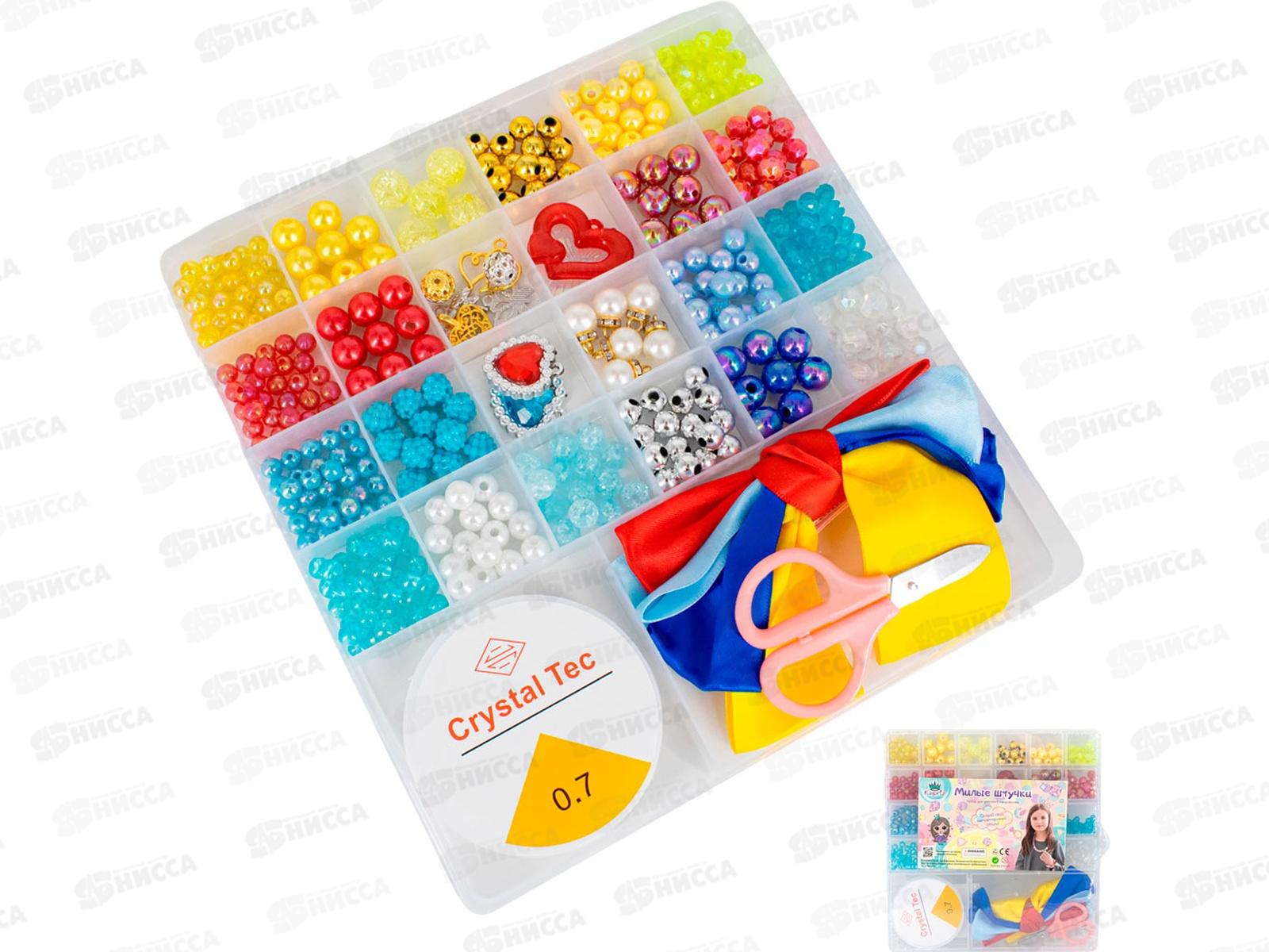 Комплектация: бусины 16 видов, подвески 8 видов, силиконовая нить-резинка, нити, заколка