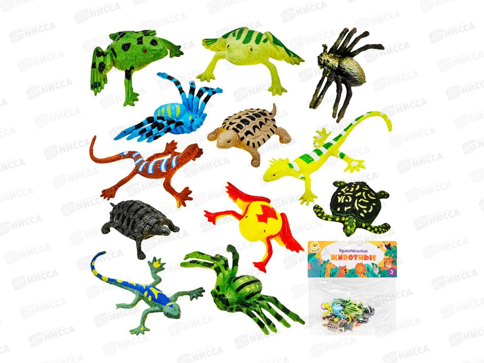 Комплектация: лягушка (6х6 см) - 3 шт, паук (5х3,5 см) - 3 шт, черепаха 2,5х4 см) - 3 шт, ящерица (6х4 см) - 3 шт.