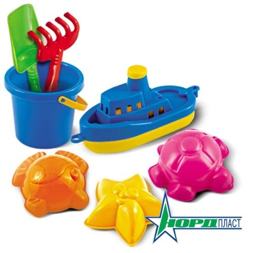 Комплектация: ведерко, кораблик, грабли, лопатка, 3 формочки
