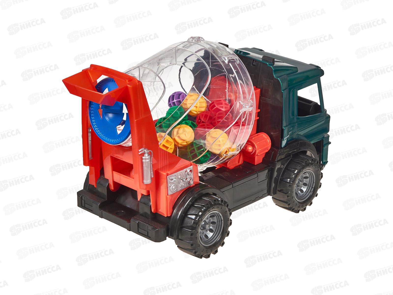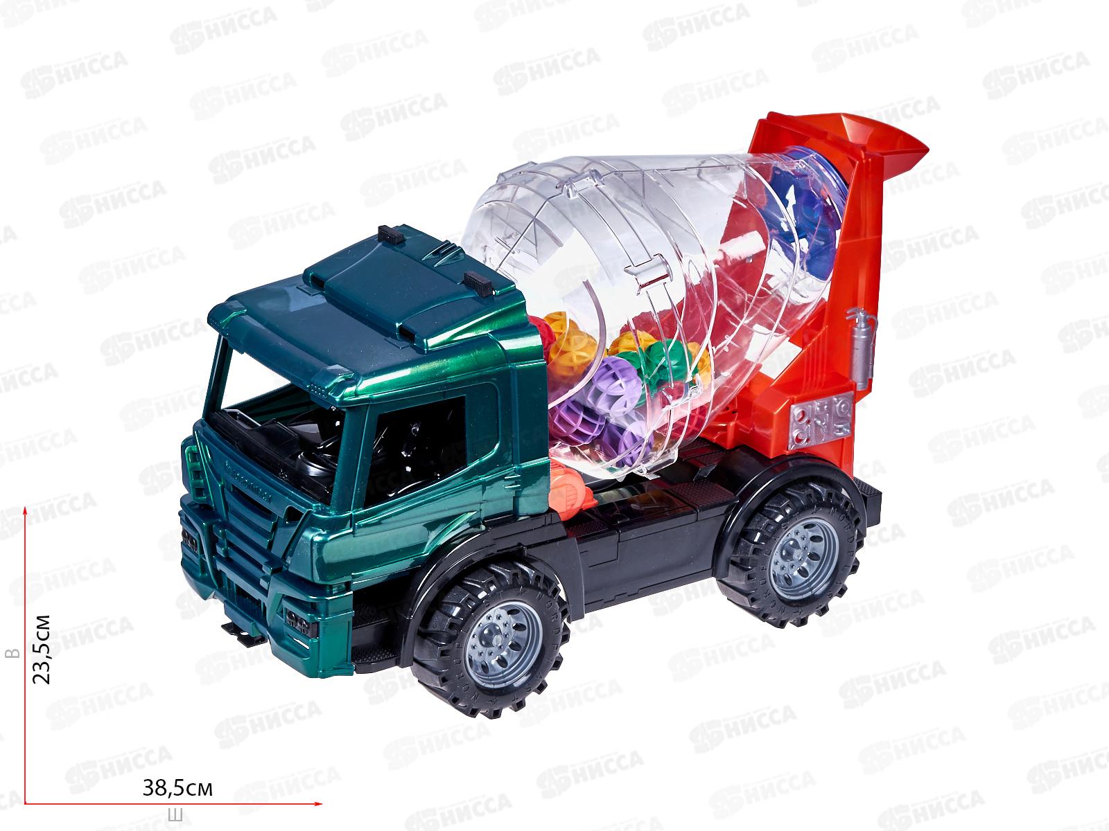 Машинка представляет собой уменьшенную копию настоящей бетономешалки, барабан которой крутится и заполнен цветными шариками. Внутрь салона можно поместить фигурку водителя.