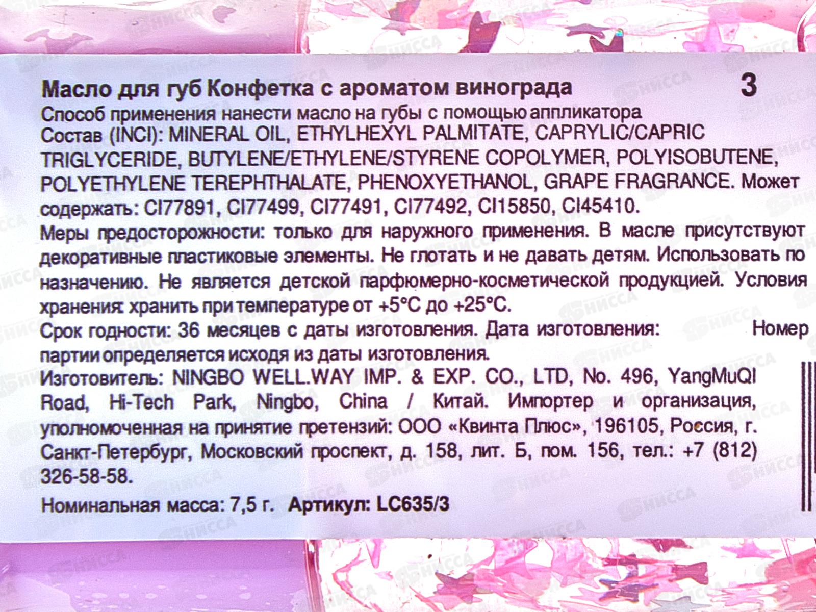 Состав: минеральное масло, этилгексил пальмитат, каприл/каприн триглицерид, сополимер бутилена/этилена/стирола, полиизобутен, полиэтилентерефталат, феноксиэтанол, виноградный ароматизатор. Могут содержать: с177891, ci77499, ci77491, ci77492, ci15850, c145410.
