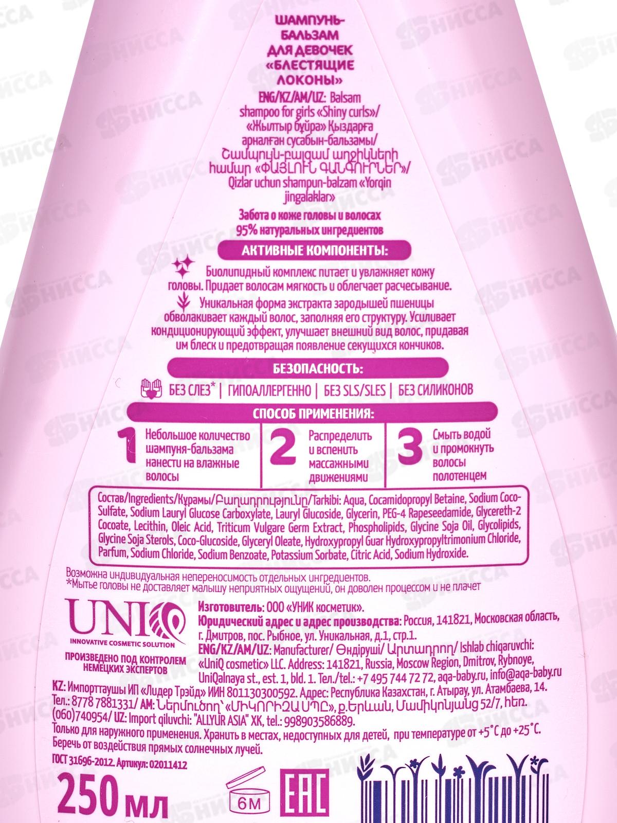 AQA baby KIDS Шампунь-бальзам для девочек Блестящие локоны 250мл *6