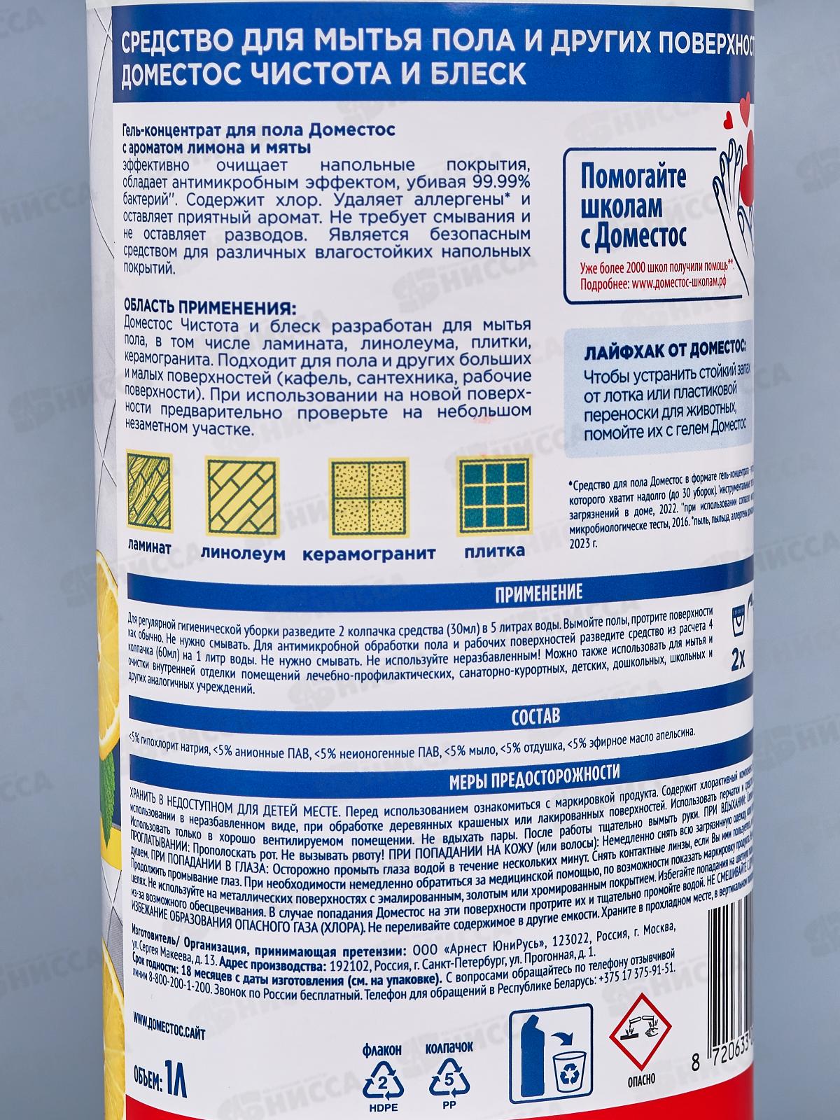 ДОМЕСТОС Гель-концентрат для пола 1л Лимон и мята *12
