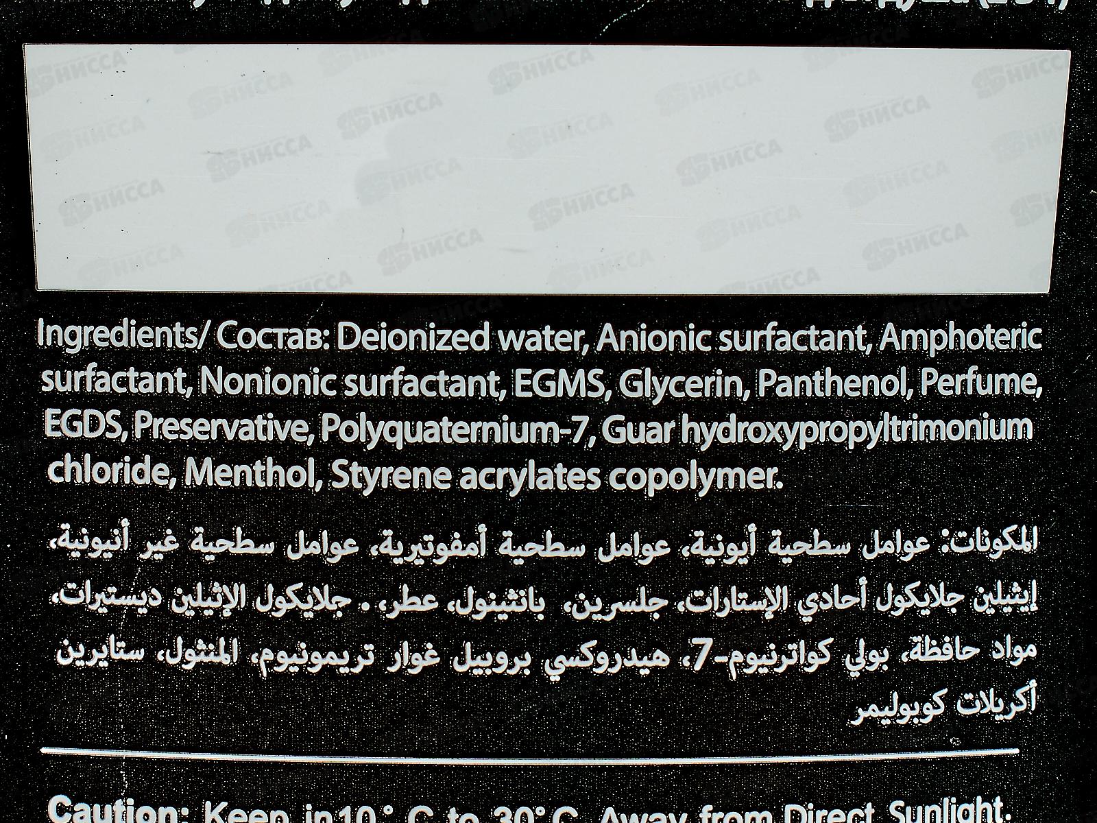Состав: Деионизированная вода, анионное поверхностно-активное вещество, амфотерное поверхностно-активное вещество, неионогенное поверхностно-активное вещество, EGMS, глицерин, пантенол, отдушка, EGDS, консервант, поликватерниум-7, хлорид гуаргидроксипропилтримония, ментол, сополимер стирола и акрилатов.