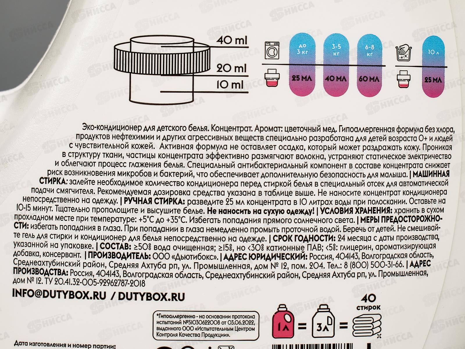 Концентрированный кондиционер придает белью мягкость после стирки и свежий аромат. Гипоаллергенный состав дерматологически протестирован и не оставляет осадка, который может раздражать кожу. Проникая в структуру ткани, частицы концентрата эффективно размягчают волокна, устраняют статическое электричество и облегчают процесс глажения белья. Бытовая химия Дьютибокс не содержит фосфатов, парабенов и продуктов нефтепереработки. Состав: болле 50% вода очищенная; более 15%, но <30% катионные ПАВ; <5%: глицерин, ароматизирующая добавка, консервант.