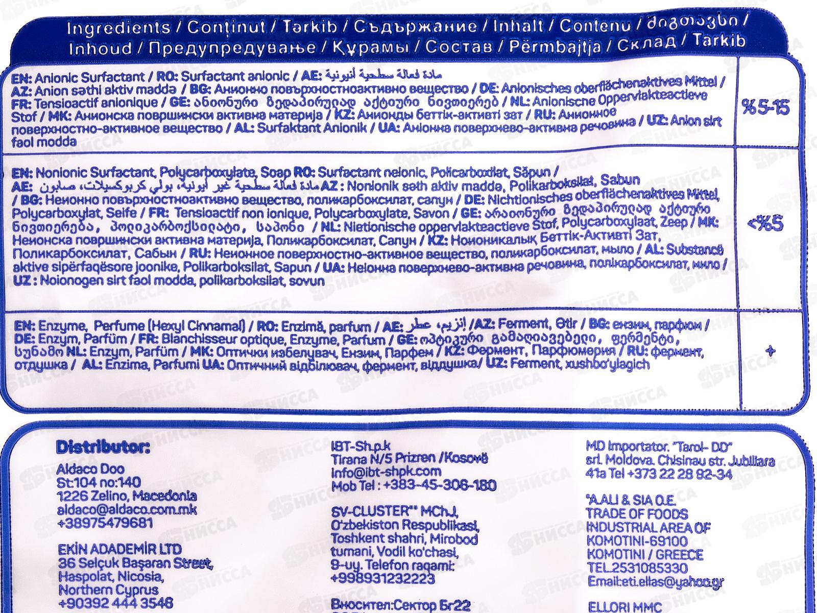Состав: анионное поверхностно-активное вещество 5-15%, неионное поверхностно-активное вещество, поликарбоксилат, мыло, оптический отбеливатель, фермент, отдушка.