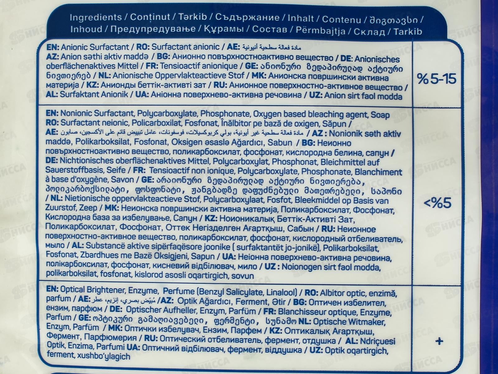 Состав: анионное поверхностно-активное вещество 5-15%, неионное поверхностно-активное вещество, поликарбоксилат, фосфонат, кислородный отбеливатель, мыло, оптический отбеливатель, фермент, отдушка.