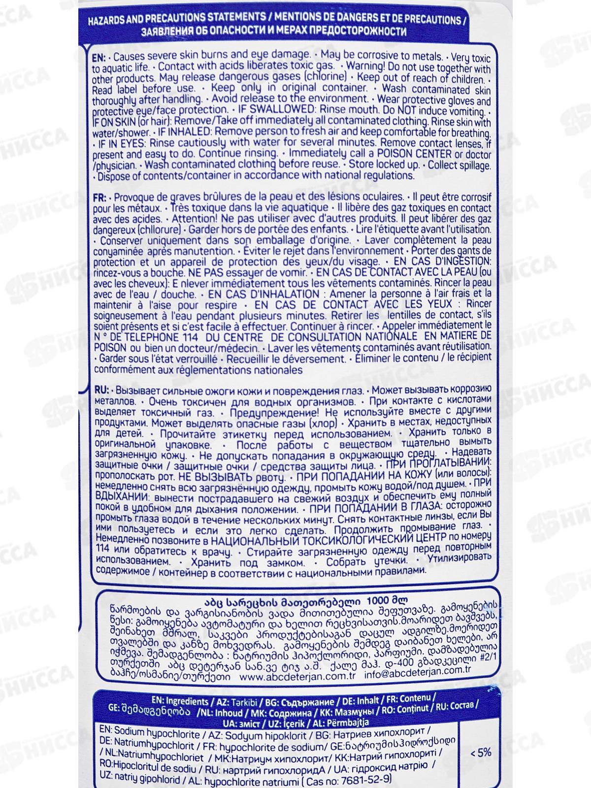 Состав: вода, натрия гипохлорит (5–10 %) — активный отбеливающий и дезинфицирующий компонент, жидкое мыло, лимонная кислота, отдушка, желтый краситель (CI 11680), синий краситель (CI 42051)