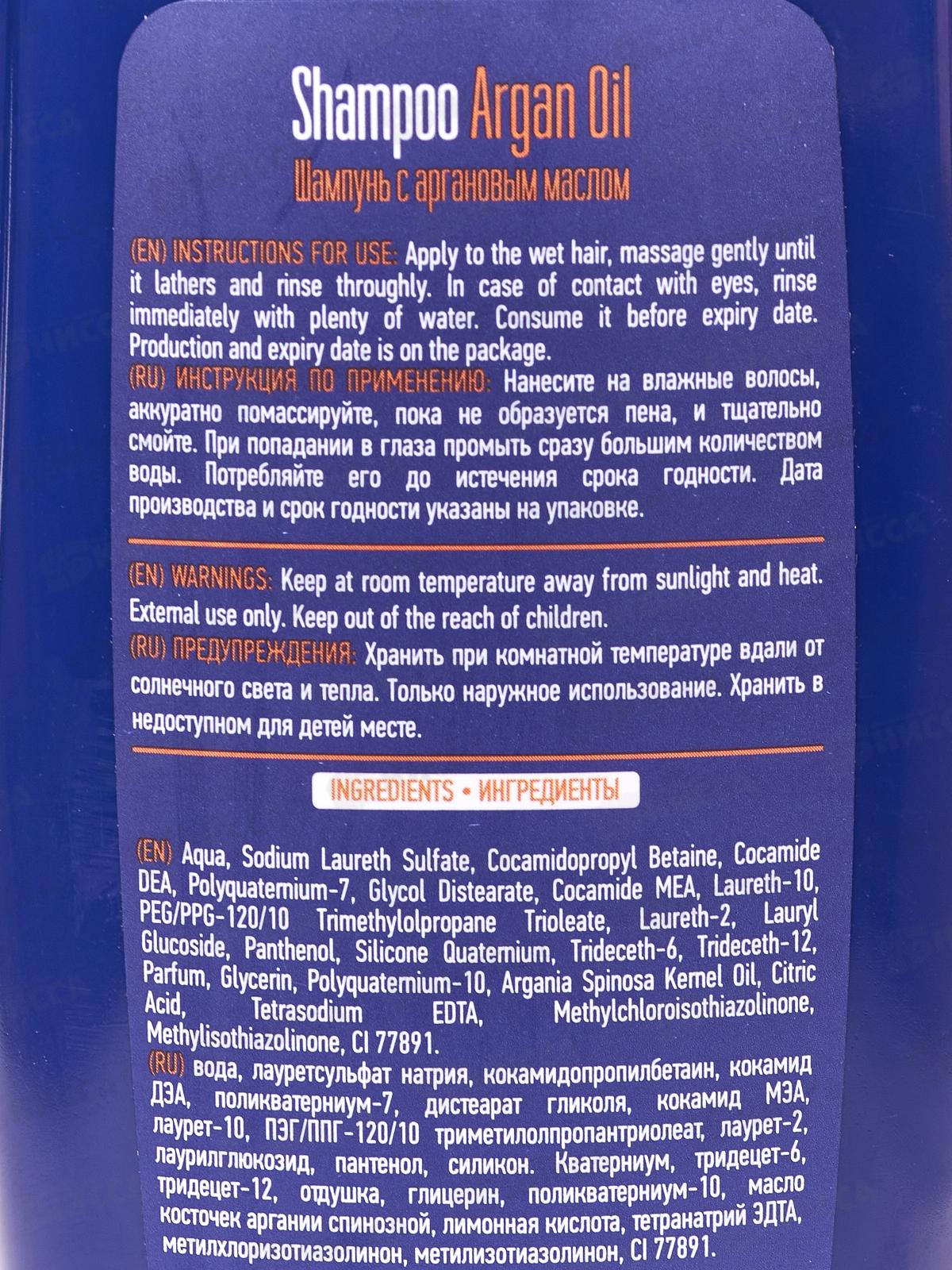 Состав: вода, лауретсульфат натрия, кокамидопропилбетаин, кокамид ДЗА, поликватерниум-7, дистеарат гликоля, кокамид МЭА, лаурет-10, ПЭГ/ППГ-120/10 триметилолпропантриолеат, лаурет-2, лаурилглюкозид, пантенол, силикон. Кватерниум, тридецет-6, тридецет-12, отдушка, глицерин, поликватерниум-10, масло косточек аргании спинозной, лимонная кислота, тетранатрий ЭДТА, метилхлоризотиазолинон, метилизотиазолинон, СІ 77891.