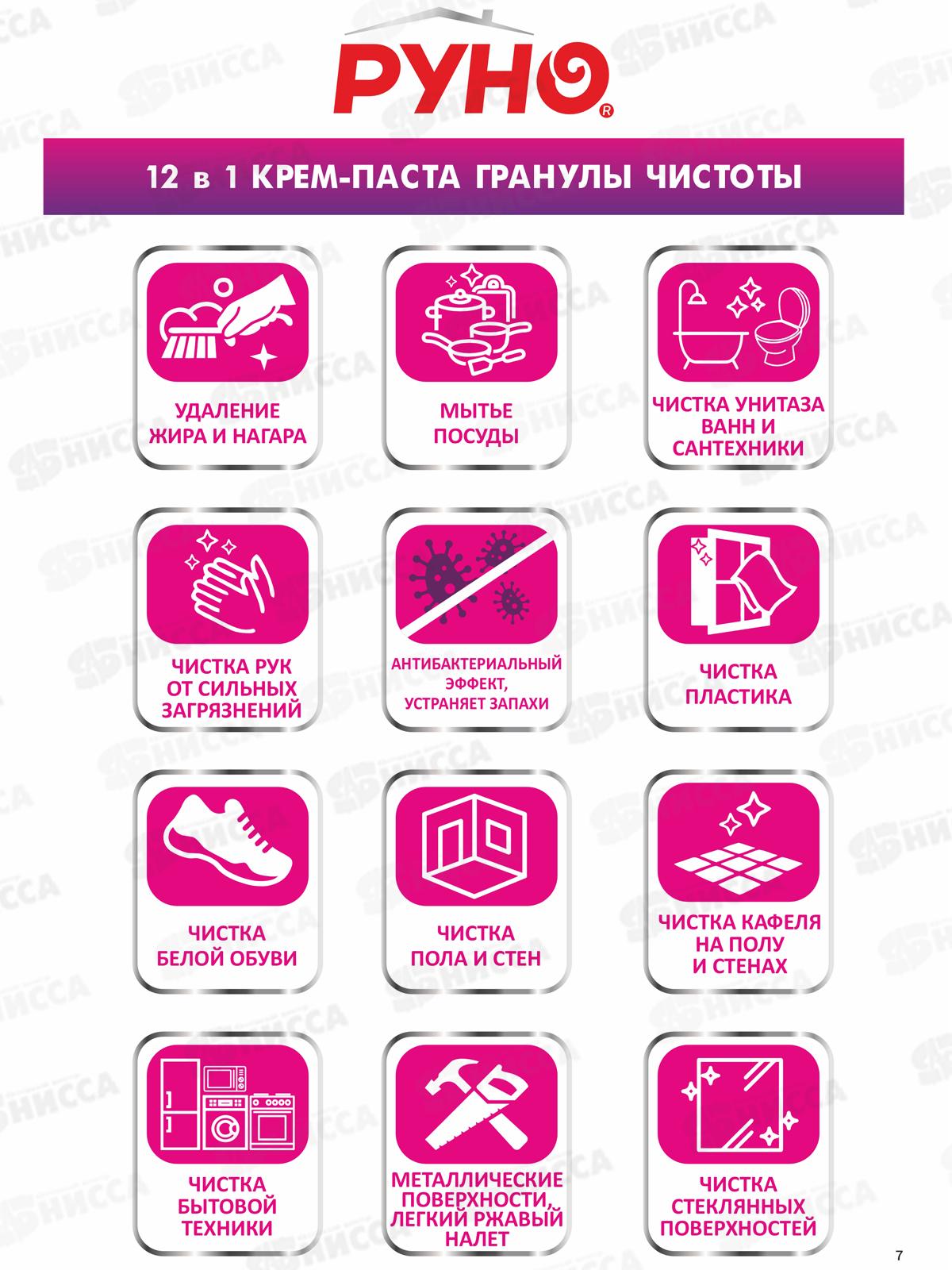 Многофункциональная универсальная Крем паста, РУНО Гранулы Чистоты, на основе мягкого природного абразива, для чистки разных поверхностей и мойки посуды. Высокоэффективная формула крем пасты быстро растворяет загрязнение изнутри, проникая его вглубь, а мягкий абразив устраняет его, не повреждая поверхности, оставляет после уборки легкий нейтральный аромат. Густая концентрированная текстура крем пасты обеспечивает продукту экономичный расход. 12 в 1. 1.Удаление жира и нагара, копоть, и известковый и ржавый налет; 2.Мытье посуды, для приготовления, столовая посуда; 3.Чистка унитаза раковин ванн и сантехники, смесители, краны, душ; 4.Чистка кафельной плитки; 5.Антибактериальный эффект, устраняет запахи; 6.Чистка рук от сильных загрязнений, мазут жир; 7.Чистка белой обуви, из текстиля; 8.Чистка бытовой техники духовка газ СВЧ, холодильник, варочные поверхности; 9.Чистка пластика, оконный, игрушки, посуда; 10.Чистка напольных покрытий, ламинат, линолеум и стен; 11.Стекляные поверхности, посуда, варочные поверхности; 12.Металические и деревянные поверхности.СОСТАВ: микрокальцит более 30%, вода, очищенная 15 -30%, анионные ПАВ 5-15%, неиногенный ПАВ до 5%, натрий ТПФ, комплексные добавки,отдушка, консервант, регулятор кислотности.