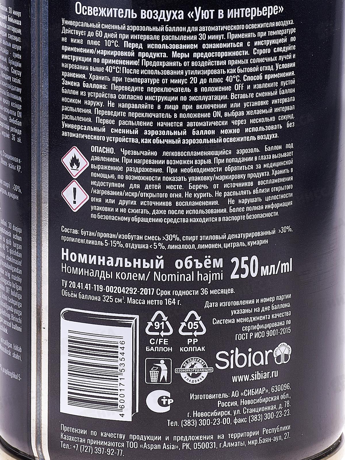Состав: бутан/пропан/изобутан смесь >30%, спирт этиловый денатурированный >30%, пропиленгликоль 5-15%, отдушка <5%, гексилциннамаль, линалоол, цитраль.