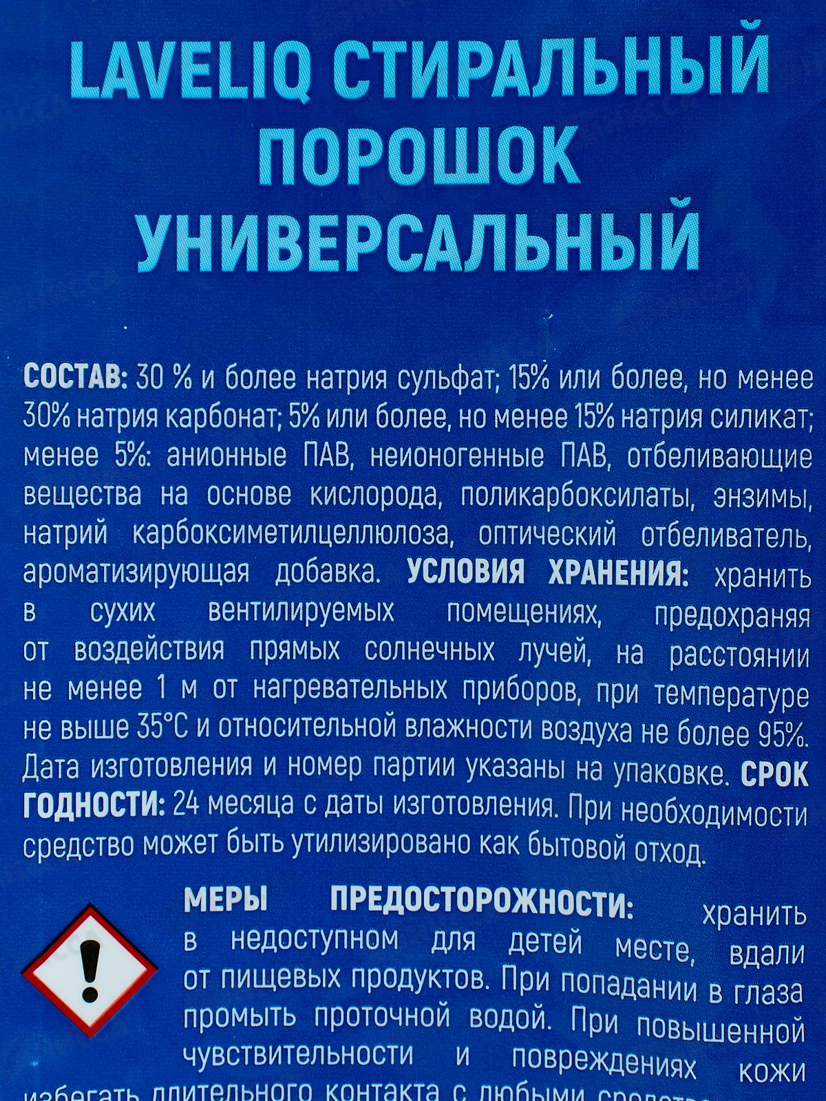 Состав: 30 % и более натрия сульфат; 15% или более, но менее 30% натрия карбонат; 5% или более, но менее 15% натрия силикат; менее 5%: анионные ПАВ, неионогенные ПАВ, отбеливающие вещества на основе кислорода, поликарбоксилаты, энзимы, натрий карбоксиметилцеллюлоза, оптический отбеливатель, ароматизирующая добавка.