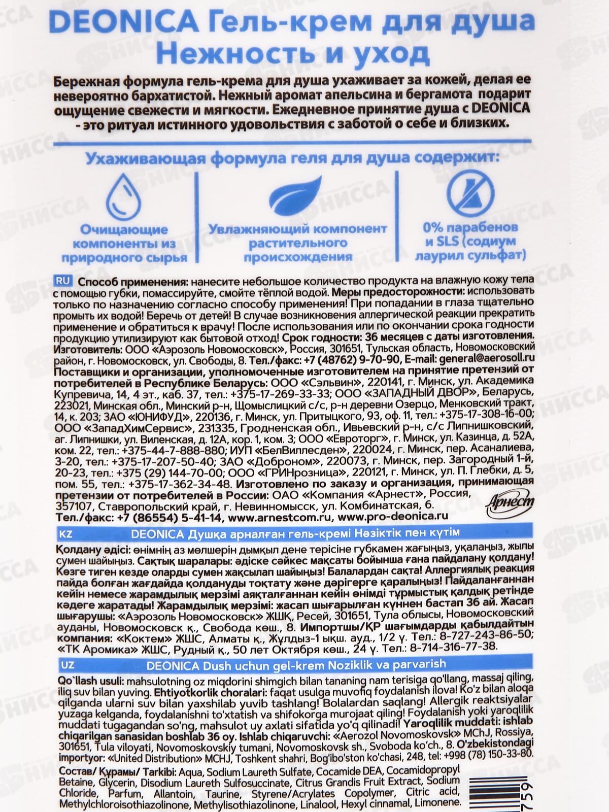 Состав: вода, лауретсульфат натрия, кокамид ДЭА, кокамидопропилбетаин, глицерин, лауретсульфосукцинат динатрия, экстракт плодов померанца, хлорид натрия, отдушка, аллантоин, таурин, сополимер стирола и акрилатов, лимонная кислота, метилхлоризотиазолинон, метилизотиазолинон, линалоол, гексилциннамаль, лимонен.