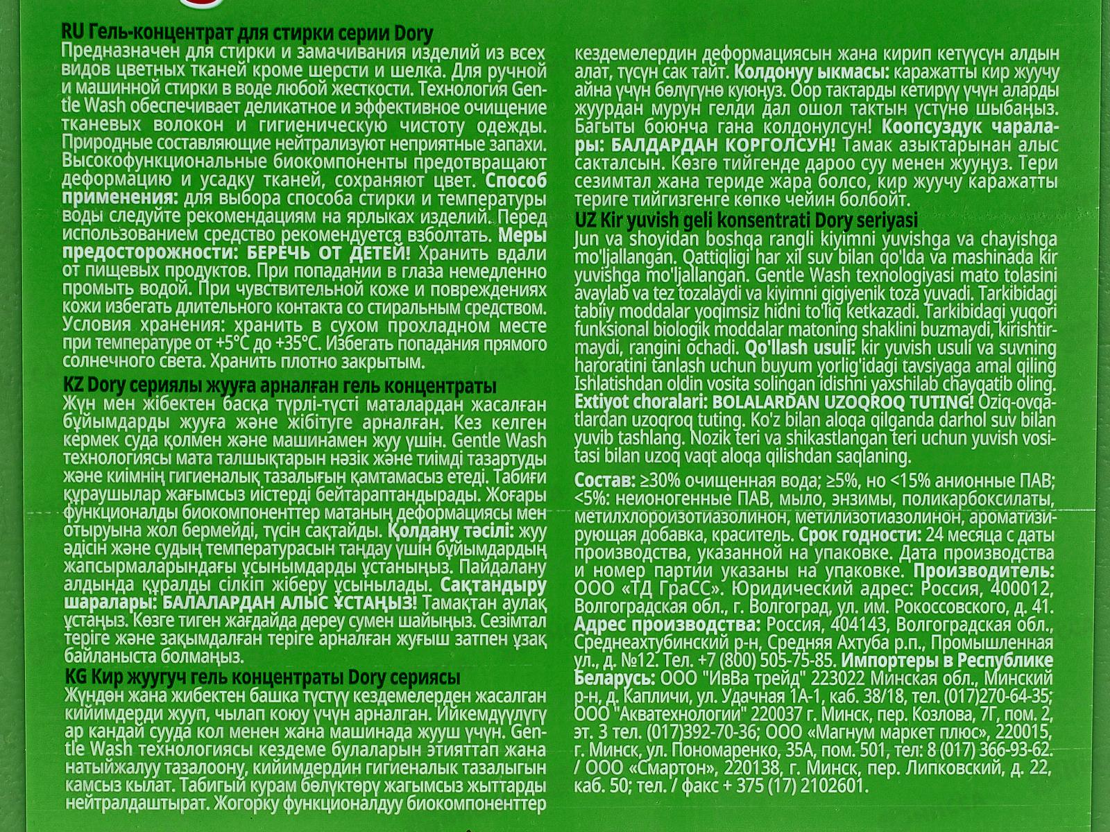 Гель для стирки Dory Color. Предназначен для стирки и замачивания изделий из цветных тканей кроме шерсти и шелка. Для ручной и машинной стирки в воде любой жесткости. Технология Gentle Wash обеспечивает деликатное и эффективное очищение тканевых волокон и гигиеническую чистоту одежды. Природные составляющие нейтрализуют неприятные запахи. Высокофункциональные биокомпоненты предотвращают деформацию и усадку тканей, сохраняют цвет. Состав: ?30% очищенная вода; ?5%, но <15% анионные ПАВ; <5%: неионогенные ПАВ, мыло, энзимы, поликарбоксилаты, метилхлороизотиазолинон, метилизотиазолинон, ароматизирующая добавка.