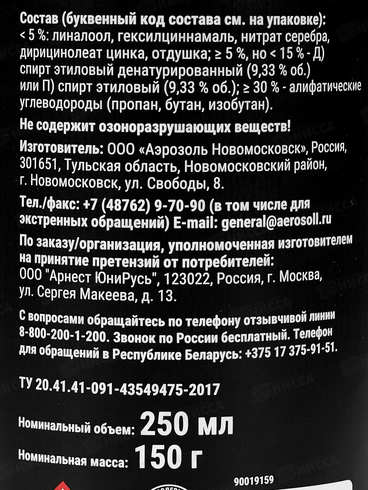 Состав: менее 5%: линалоол, гексилциннамаль, нитрат серебра, дирицинолеат цинка, отдушка; более 5%, но менее 15%: спирт этиловый денатурированный, спирт этиловый (9,33% об.); более 30%: алифатические углеводороды (пропан, бутан, изобутан). Важно: продукт не содержит озоноразрушающих веществ.