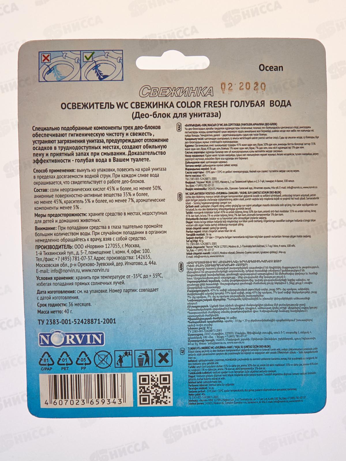 СВЕЖИНКА освежитель-блистер WC C. Голубая вода 40гр *12