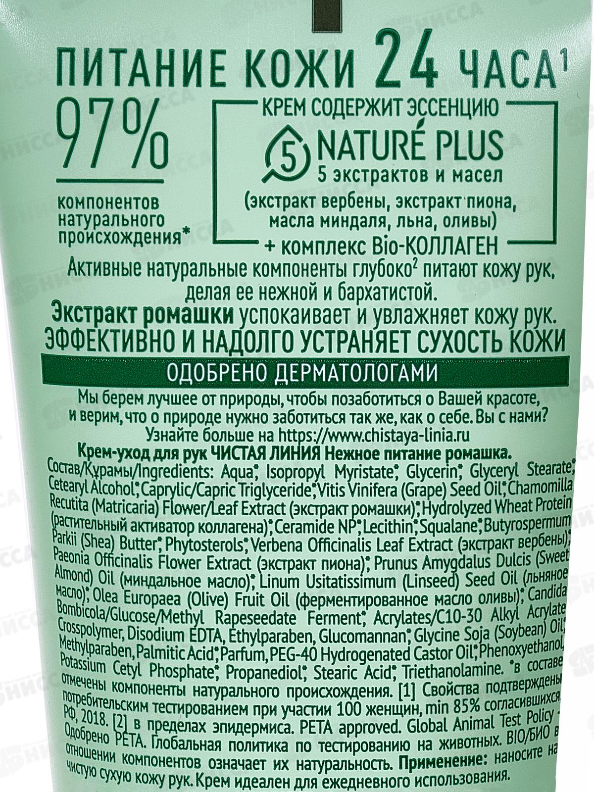 Подарите Вашим рукам особую заботу с кремом «Чистая Линия Нежное питание». До 97% компонентов натурального происхождения обеспечивают бережный уход за кожей. Входящий в состав крем-ухода, экстракт ромашки успокаивает и увлажняет кожу рук. Комплекс фитомасел глубоко питает и насыщает витаминами кожу рук, делая ее нежной и бархатистой. Насыщенная текстура крема быстро впитывается и имеет приятный аромат. Доказанная эффективность – крем-уход эффективно и надолго устраняет сухость кожи и обеспечивает ей питание 24 часа.