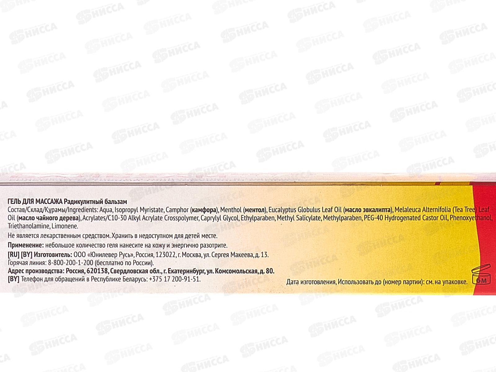 Гель для массажа «РАДИКУЛИТНЫЙ БАЛЬЗАМ» - средство для уменьшения усталости и напряжения (в сочетании с массажем). Активные компоненты: масла чайного дерева и эвкалипта улучшают кровообращение, обладают восстанавливающим действием; камфора оказывает разогревающий эффект; ментол освежает и тонизирует. Сочетание массажа с применением геля для массажа «РАДИКУЛИТНЫЙ БАЛЬЗАМ» поможет быстро снять напряжение, усталость и боль. Радикулитный бальзам - обладает разогревающим действием, улучшает микроциркуляцию в коже. Гель-бальзам плотной кремовой текстуры для всех типов кожи.