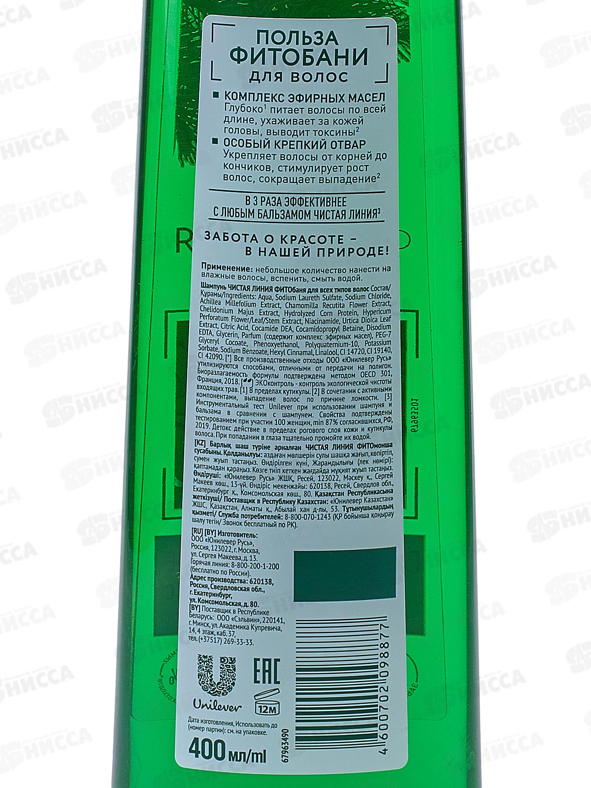 Концерн Калина Чистая Линия шампунь 400мл Фитобаня для всех типов волос *6/12
