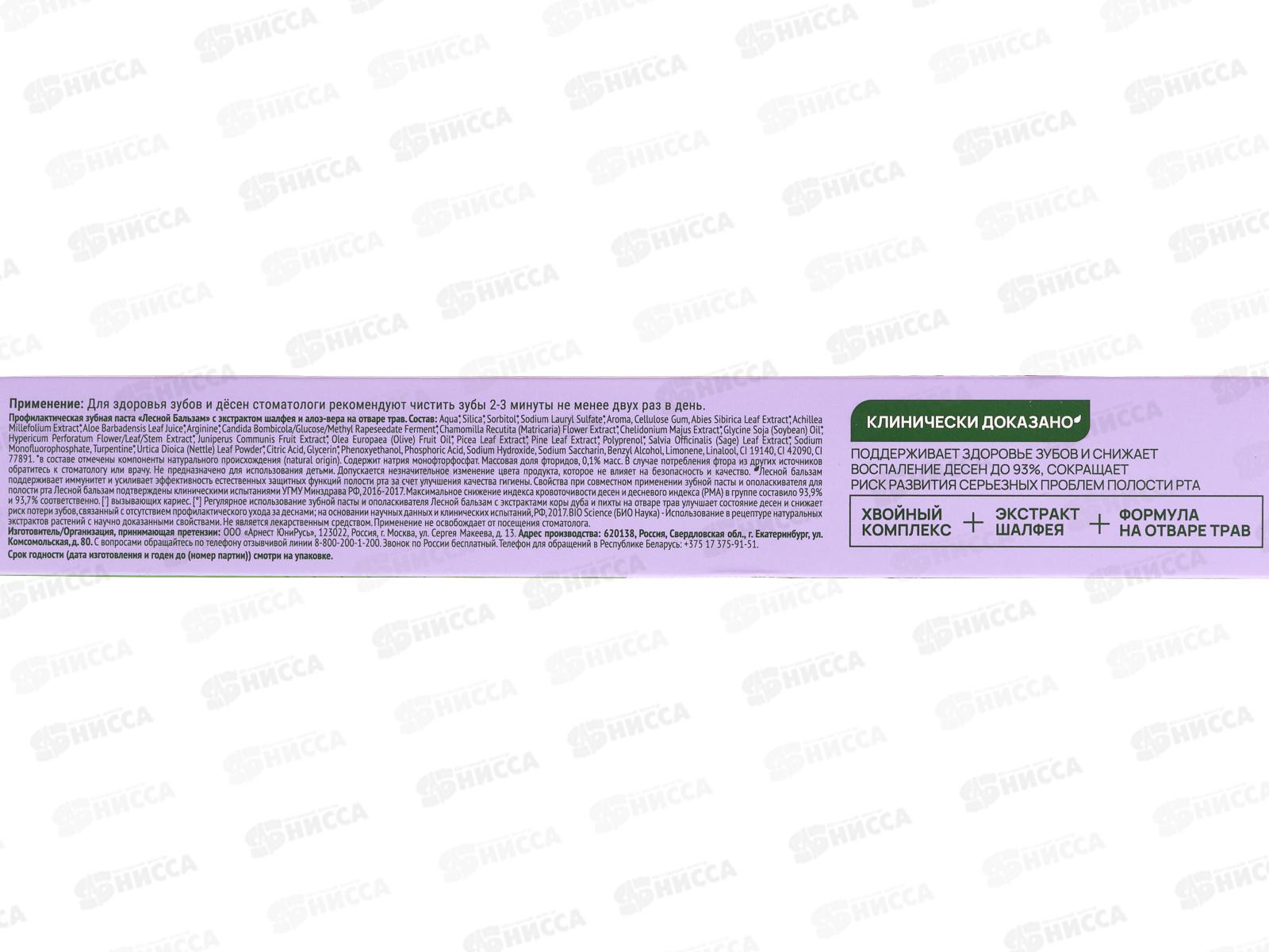 Новая зубная паста Лесной бальзам c иммуноактивным действием помогает решить проблему воспаления десен и в 2 раза улучшает работу собственного иммунитета полости рта, снижая риск развития проблем с деснами. Клинически-доказанный эффект: с первого применения исчезает болезненность десен. До 94% снижает воспаление десен при регулярном использовании. В 5 раз снижает скорость образования налета на зубах, уменьшая бактериальную нагрузку на мягкие ткани полости рта. Особенности состава: насыщенный хвойный вкус. Содержит хвойных комплекс (на основе экстрактов пихты, живицы, можжевельника) с отваром 5 целебных трав, экстрактом шалфей и соком алоэ. Богатый натуральный состав способствует снижению воспалений и отечности десен, блокирует развитие воспалительного процесса и стимулирует восстановление мягких тканей полости рта.