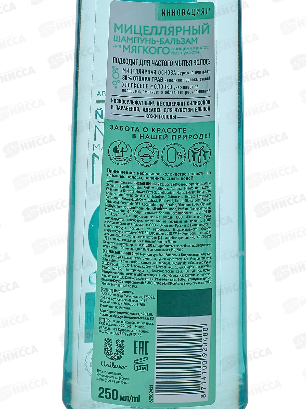 Концерн Калина Чистая Линия шампунь 250мл 2в1 мицеллярный *6/12