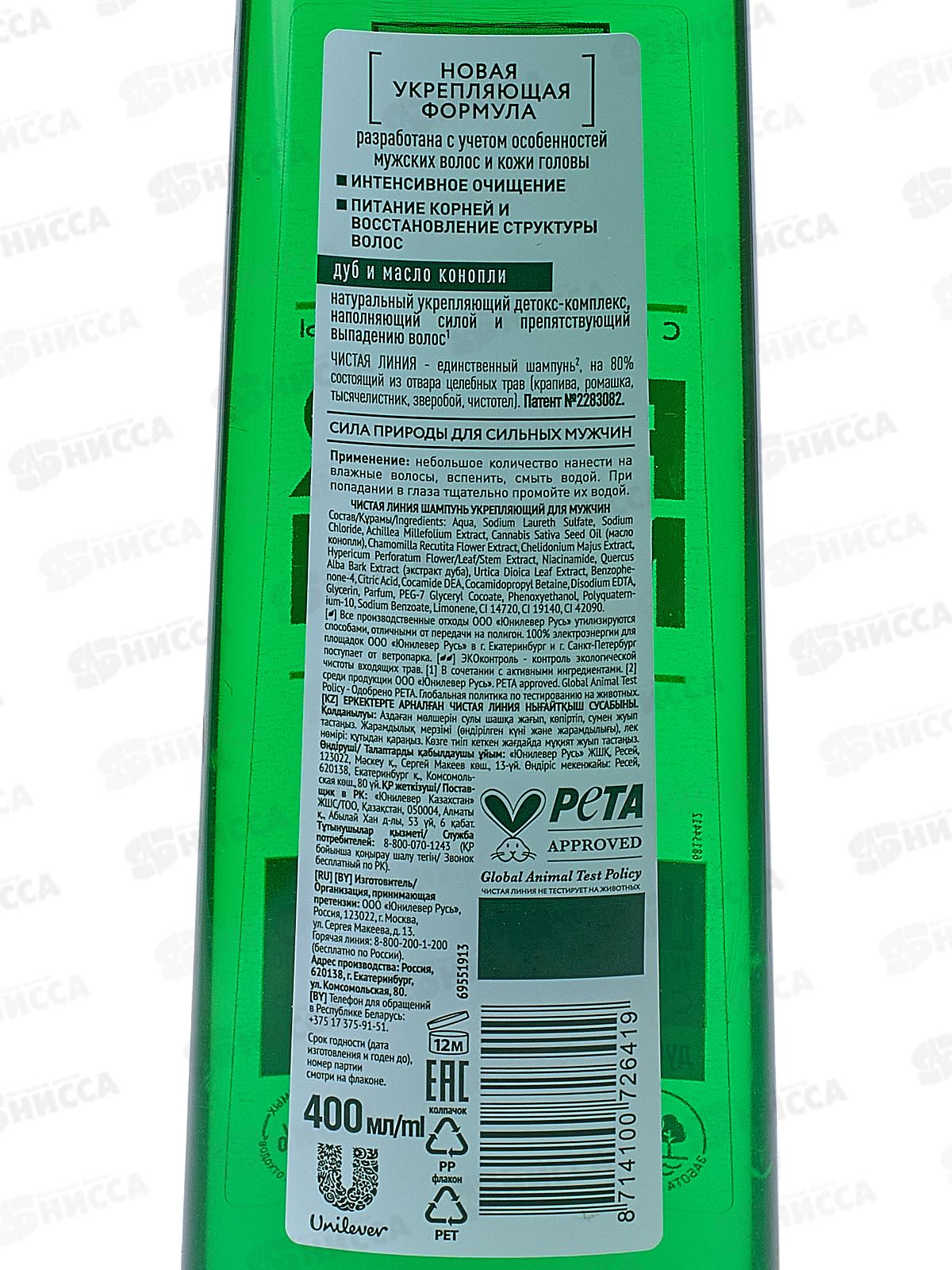 Концерн Калина Чистая Линия шампунь 400мл Укрепляющий мужской *6/12