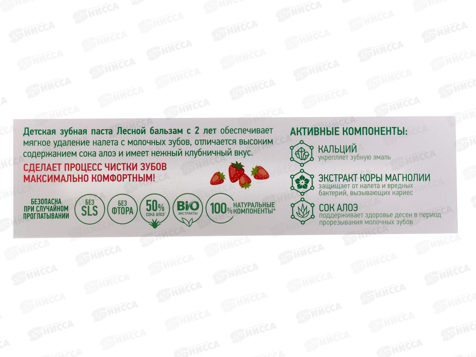 Детская зубная паста "Лесной бальзам" 2+ с высоким содержанием сока алоэ и кальцием мягко очищает налет, способствует правильному созреванию эмали молочных зубов и поддержанию иммунитета полости рта. Паста имеет нежный клубничный вкус и призвана сделать процесс первой чистки зубов максимально комфортным.