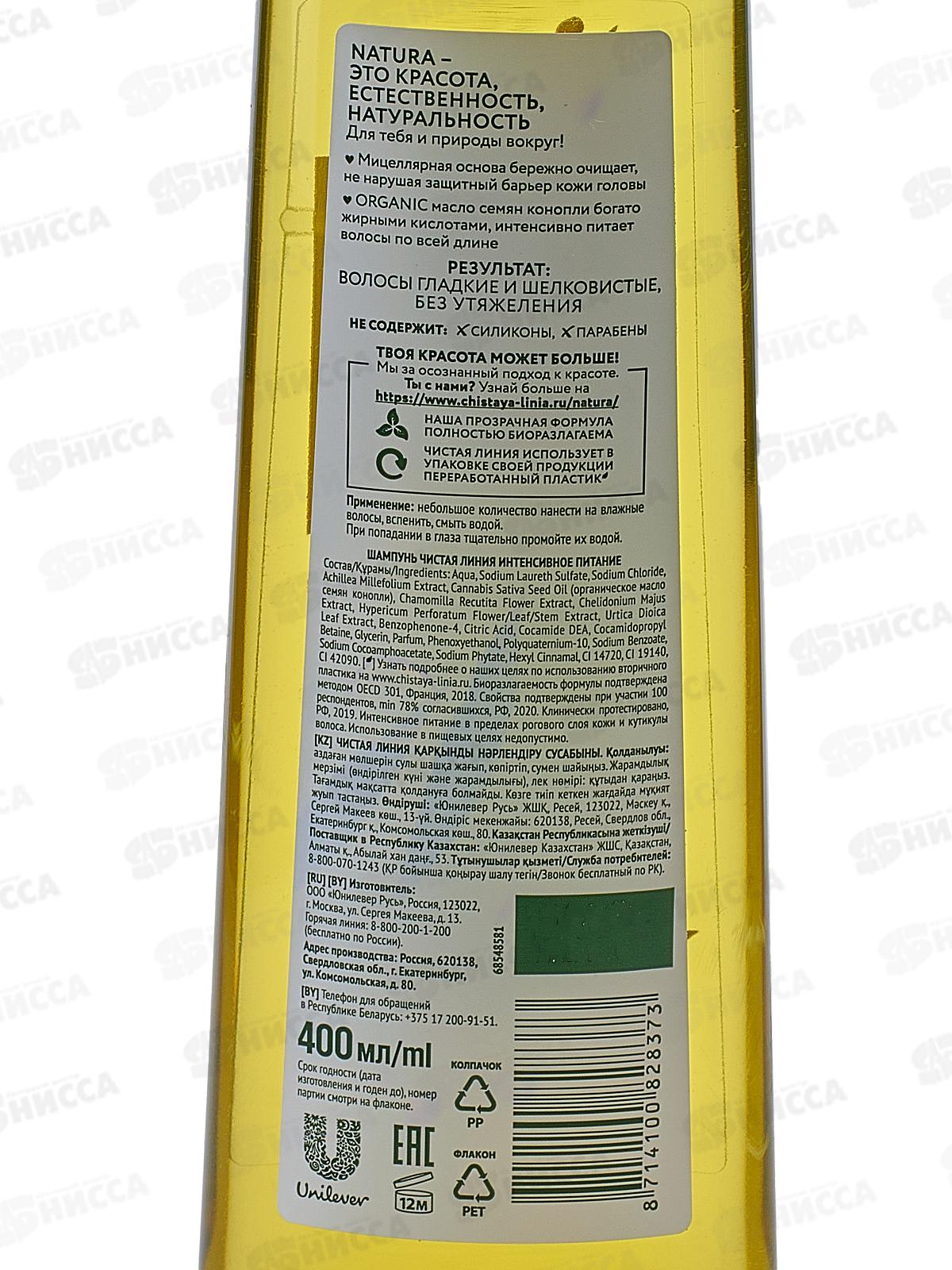 Концерн Калина Чистая Линия шампунь 400мл Интенсивное питание *6/12
