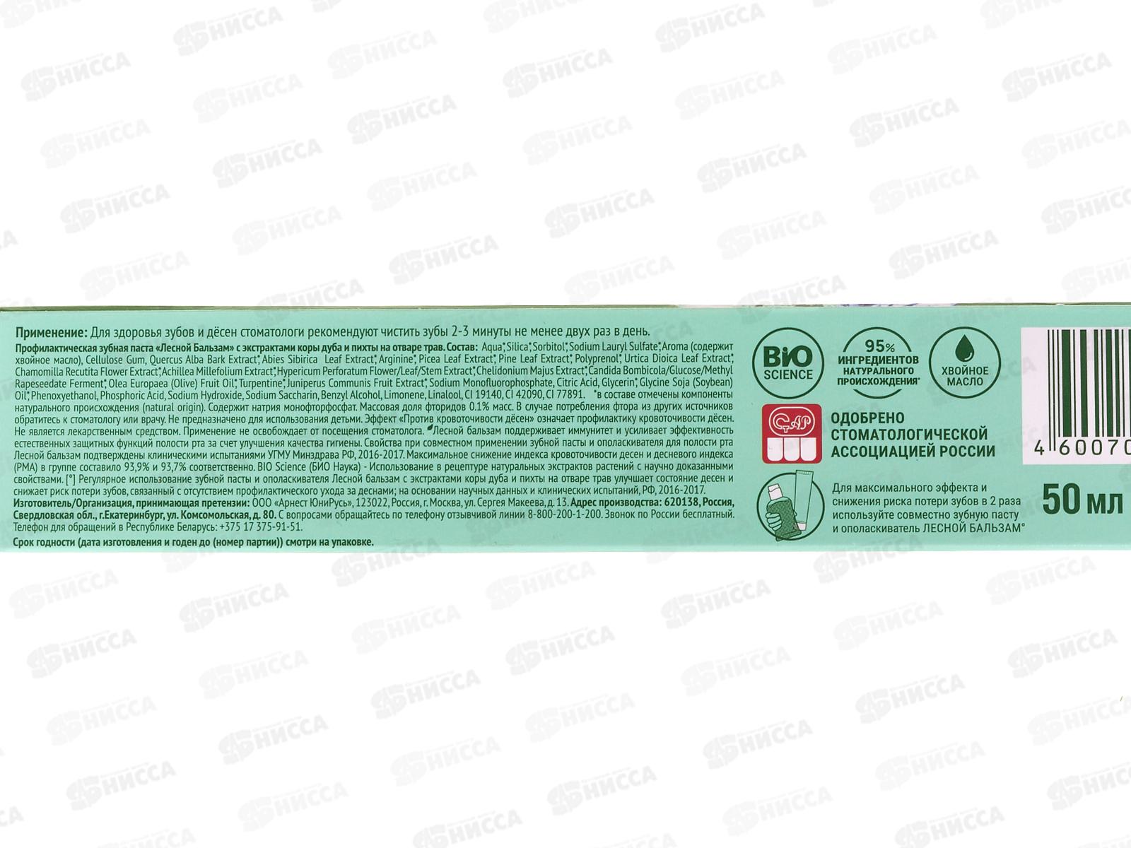 ЛЕСНОЙ БАЛЬЗАМ ЗУБНАЯ ПАСТА С КОРОЙ ДУБА ПРИ КРОВОТОЧИВОСТИ ДЕСЕН - содержит сбалансированный состав экстрактов трав и способствует укреплению десен, снижению кровоточивости десен. Внешний вид и свойства: пастообразная текстура светло-зеленого цвета с запахом трав. Новая зубная паста "Лесной бальзам" c иммуноактивным действием помогает решить проблему кровоточивости десен и в 2 раза улучшает работу собственного иммунитета полости рта, снижая риск развития проблем с деснами. Клинически-доказанный эффект: с первого применения улучшает состояние десен. До 94% снижает кровоточивость десен при регулярном использовании. В 5 раз снижает скорость образования налета на зубах, уменьшая бактериальную нагрузку на мягкие ткани полости рта. Особенности состава: насыщенный хвойный вкус; содержит хвойный комплекс (на основе экстрактов пихты, живицы, можжевельника) с отваром 5 целебных трав и экстрактом коры дуба. Богатый натуральный состав способствует укреплению кровеносных сосудов десен, улучшает кровообращение и питание в мягких тканях полости рта, препятствует повторному возникновению кровоточивости при чистке зубов. Зубная паста изготовлена на отваре 5 трав (ромашка, тысячелистник, крапива, зверобой, чистотел). Отвар трав используется взамен обычной воды и получается в результате низкотемпературной экстракции (35%), что позволяет достичь максимально полного переноса ценных веществ из растений в отвар. Зубная паста бережно очищает эмаль за счет природного абразива - диоксида кремния (Silica). Диоксид кремния не царапает эмаль в процессе чистки зубов, при этом позволяет добиться равномерного удаления налета по всей поверхности зубов. Зубная паста содержит фтор на уровне 1000 ppm, что соответствует среднему уровню содержания фторидов и подходит для ежедневной защиты эмали от деминерализации.