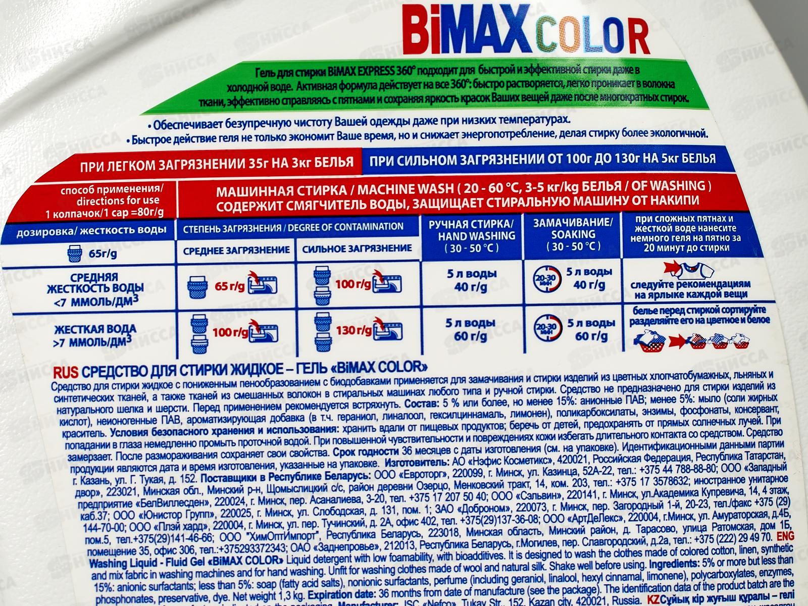 Состав: 5% или более, но менее 15%: анионные ПАВ; менее 5%: неионогенные ПАВ, мыло (соли жирных кислот), отбеливающие вещества на основе кислорода, энзимы, оптический отбеливатель, поликарбоксилаты, фосфонаты, ароматизирующая добавка (в т.ч. гексилциннамаль).