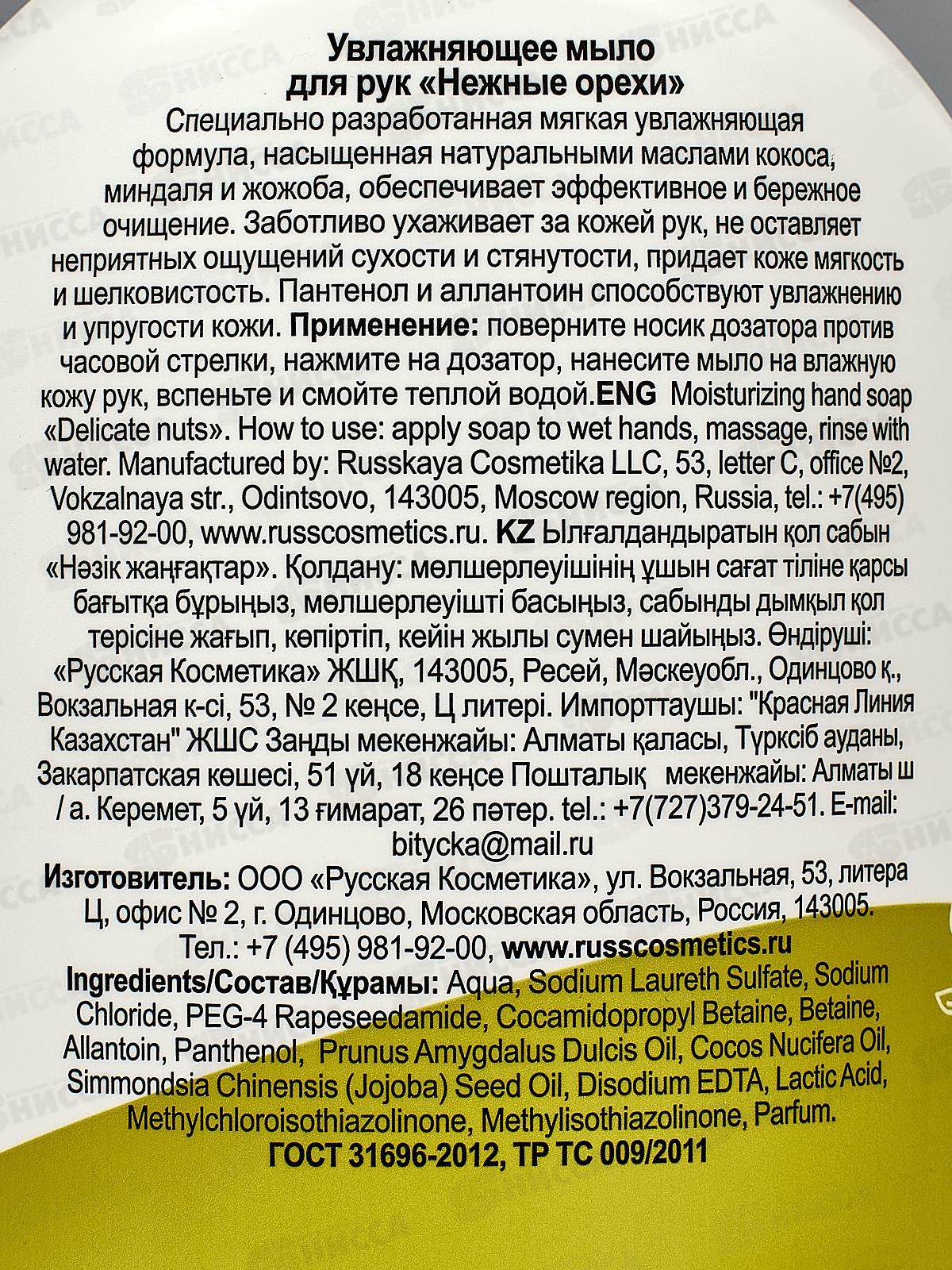 Состав: вода, лауретсульфат натрия, хлорид натрия, ПЭГ-4 амид рапса, кокамидопропилбетаин, бетаин, аллантоин, пантенол, масло сладкого миндаля (Prunus Amygdalus Dulcis), масло кокоса (Cocos Nucifera), масло семян жожоба (Simmondsia Chinensis), динатриевая соль ЭДТА, молочная кислота, метилхлоризотиазолинон, метилизотиазолинон, парфюмерная композиция.
