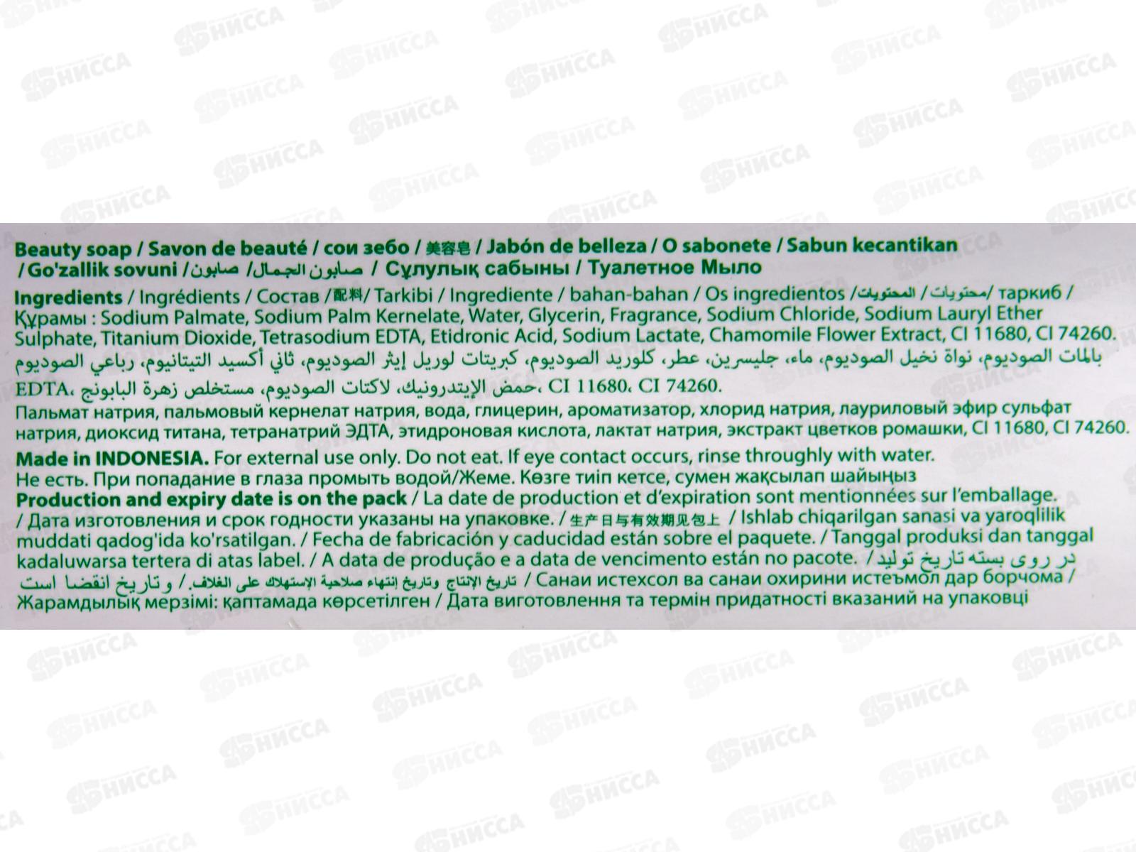 Состав: пальмат натрия, пальмовый кернелат натрия, вода, глицерин, ароматизатор, хлорид натрия, лауриловый эфир сульфат натрия, диоксид титана, тетранатрий ЭДТА, этидроновая кислота, лактат натрия, экстракт цветков ромашки, Cl 11680, CI 74260.