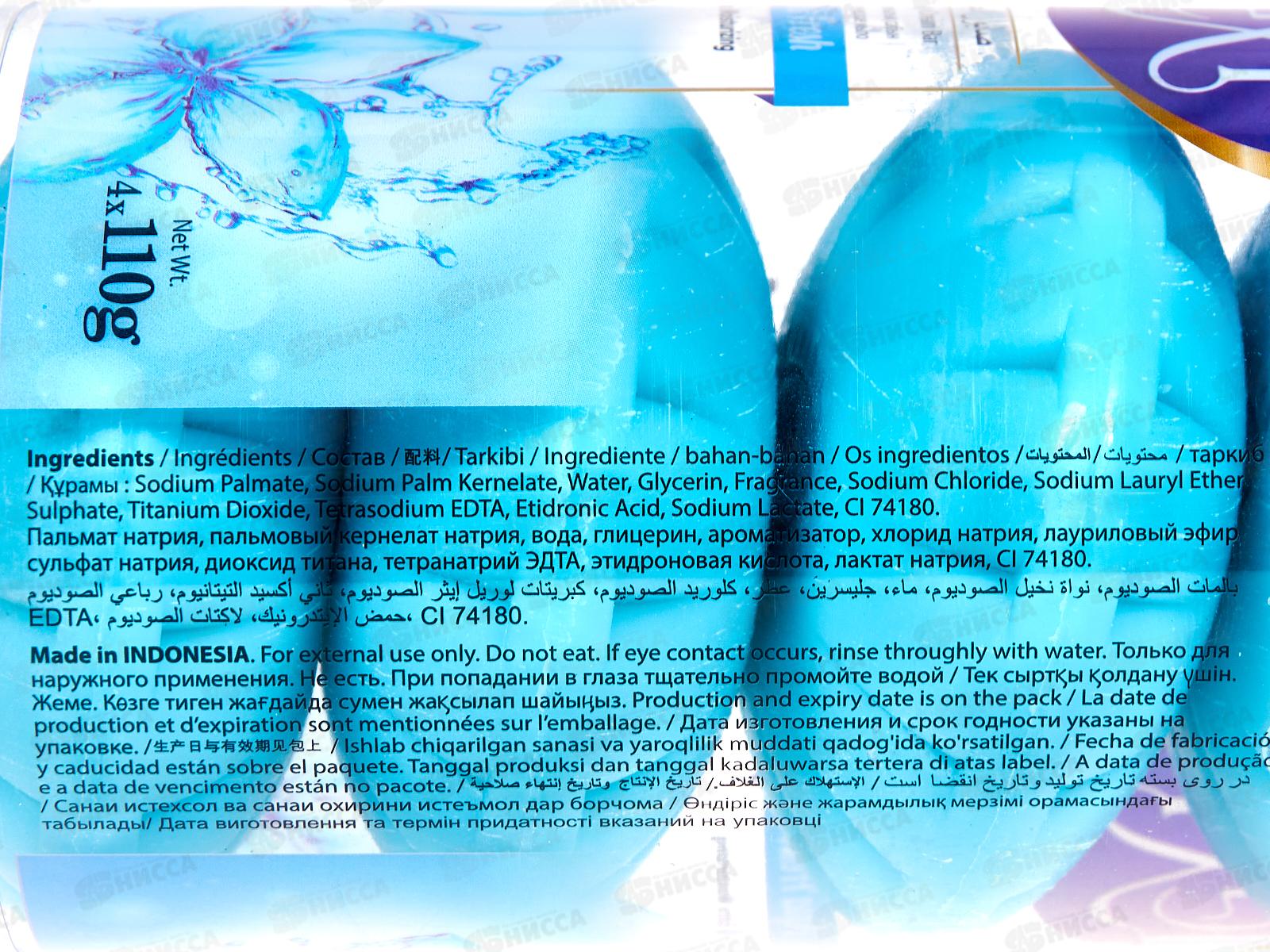 Состав: пальмат натрия, пальмовый кернелат натрия, вода, глицерин, арома изатор, хлорид натрия, лауриловый эфир сульфат натрия, диоксид титана, тетранатрий ЭДТА, этидроновая ки слота, лактат натрия, Cl 74188.