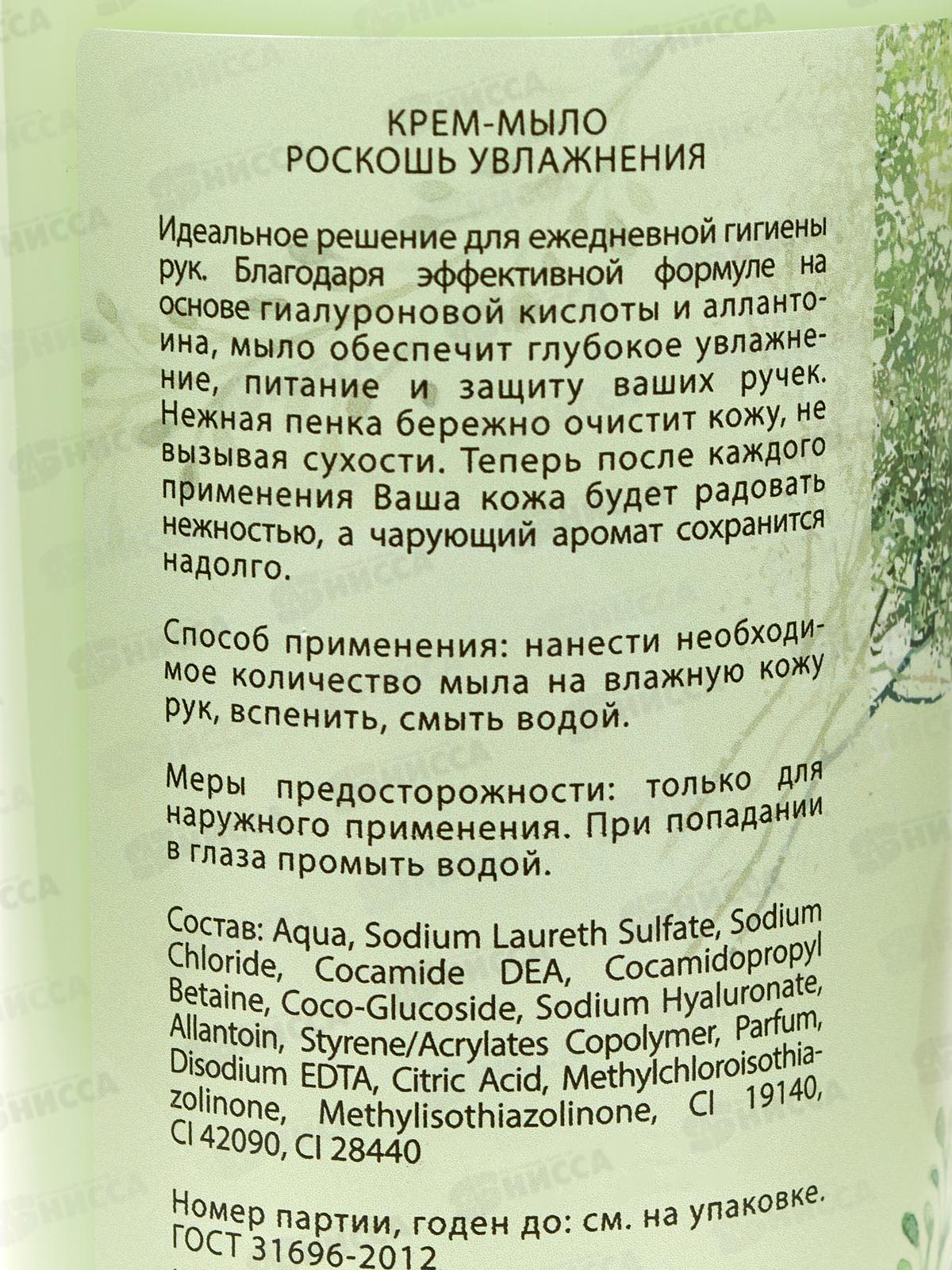 Состав: Вода, лауретсульфат натрия, хлорид натрия, кокамид ДЭА, кокамидопропилбетаин, кокоглюкозид, гиалуронат натрия, аллантоин, сополимер стирола и акрилатов, ароматизатор, динатриевая соль ЭДТА, лимонная кислота, метилхлоризотиазолинон, метилизотиазолинон, жёлтый краситель (CI?19140), синий краситель (CI?42090), красный краситель (CI?28440).