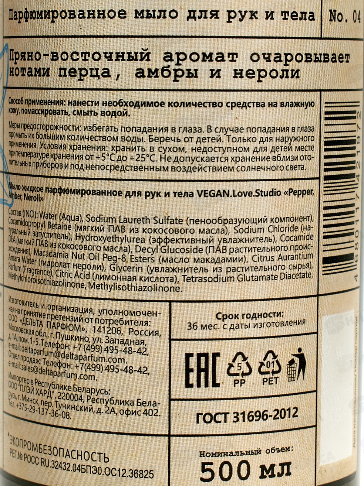 Vegan L.S. Мыло для рук и тела парфюм Pepper .Amber.Neroli 500мл *12