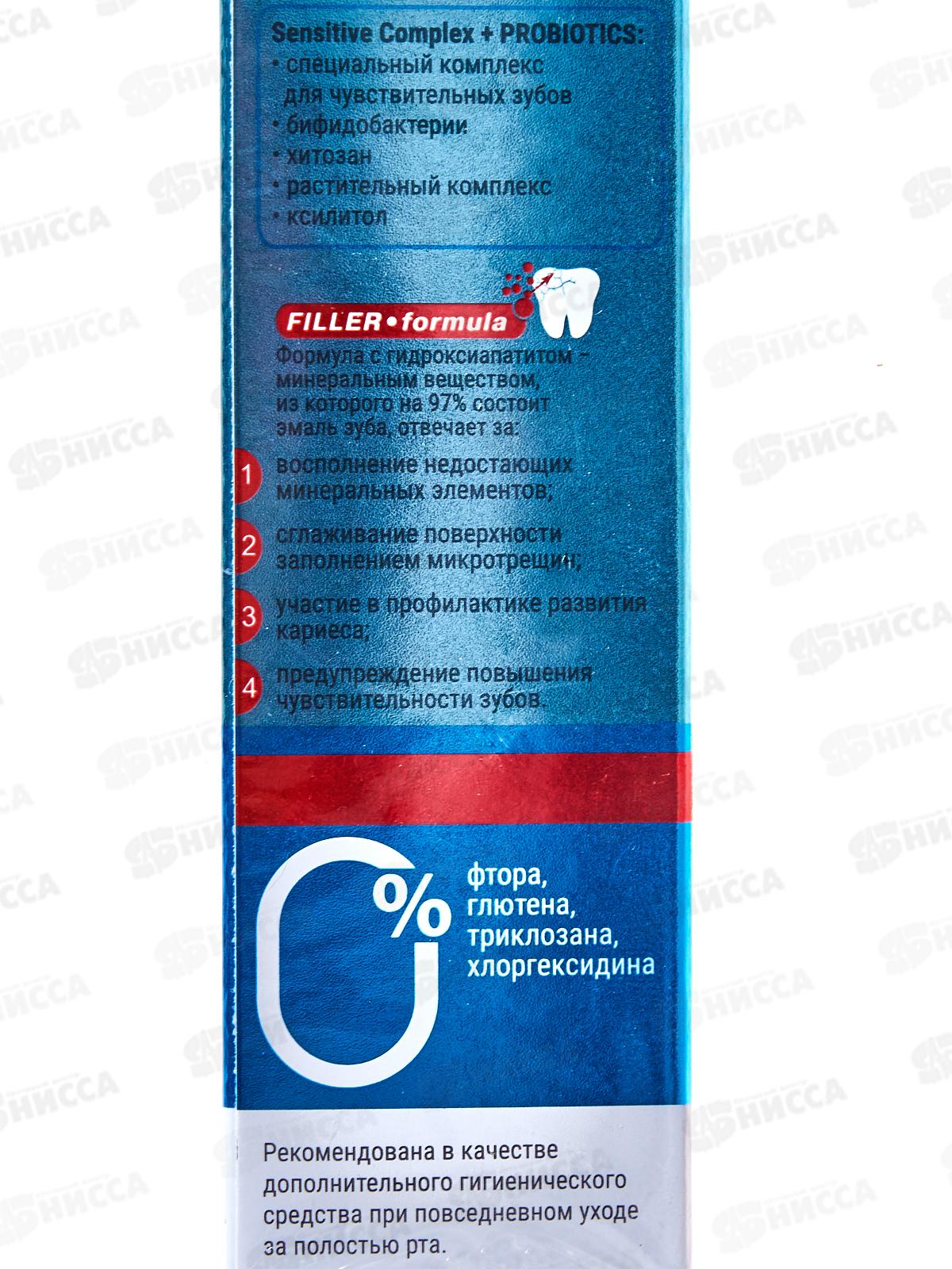 Состав: вода, гидратированный диоксид кремния, глицерин, сорбитол, гидроксиапатит, ксилит, целлюлозная камедь, сахаринат натрия, лаурилсульфат натрия, ксантановая камедь, папаин, хитозан, фермент стрептококка термофильного, бифидобактерии, экстракт листьев алоэ древовидного, экстракт листьев камелии китайской (зелёного чая), экстракт листьев эвкалипта шаровидного, экстракт цветков календулы лекарственной, ацетат токоферола, ментол, бензоат натрия.