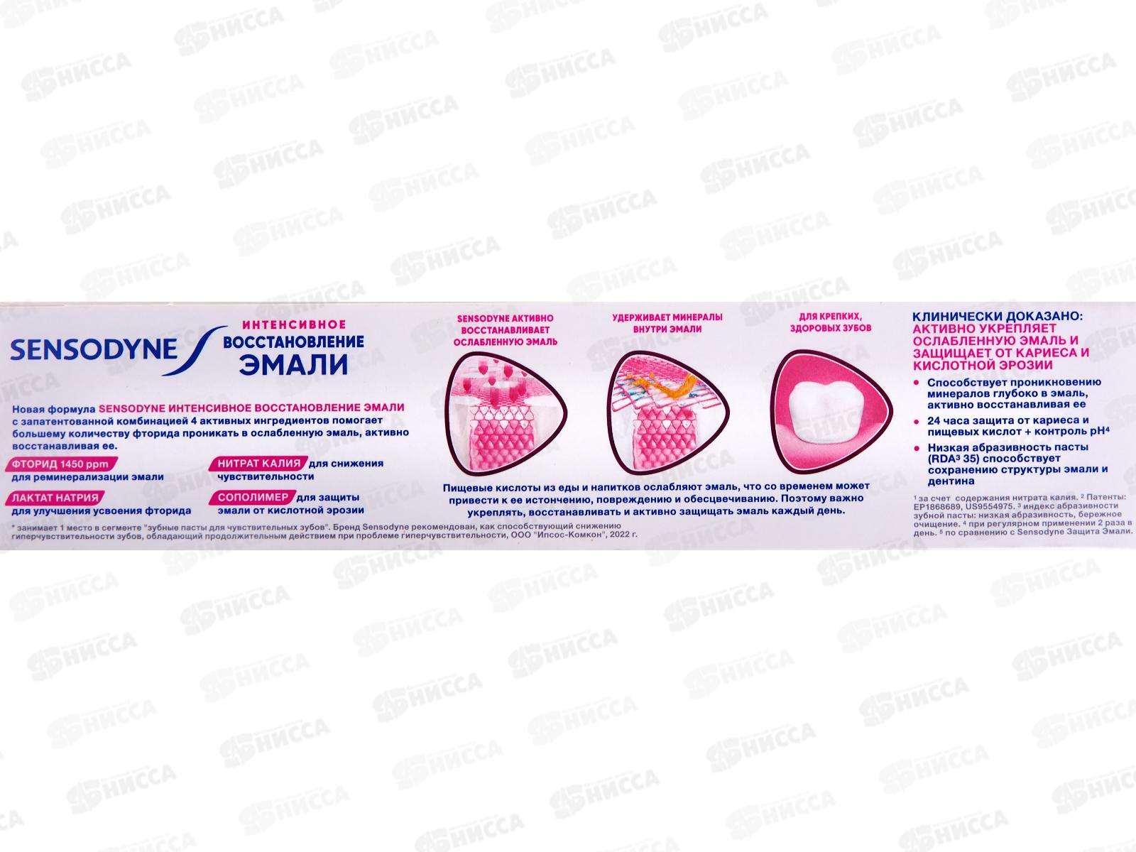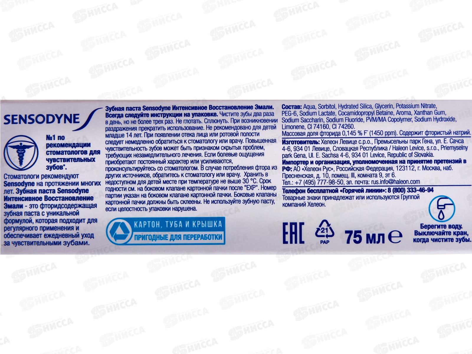 Sensodyne Интенсивное Восстановление Эмали — зубная паста для восстановления ослабленной эмали, защиты от кариеса и кислотной эрозии, а также снижения повышенной чувствительности 24/7. Содержит фтористый натрий. Состав: Вода, Сорбит, Гидратированный диоксид кремния, Глицерин, нитрат калия, ПЭГ-6, Кокамидопропилбетаин, Ароматизатор, Ксантановая камедь, фторид натрия, Сахарин натрия, гидроксид натрия, Лимонен, Анисовый спирт, CI 42090.