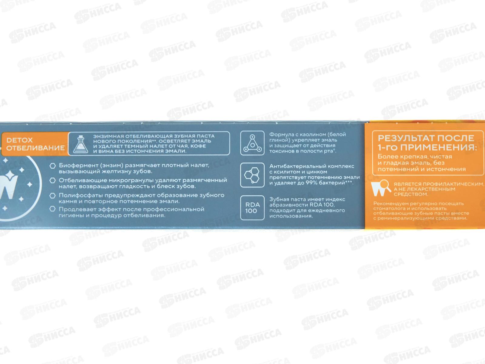 Показания: отбеливание, защита от кариеса и токсинов, от налета и зубного камня, укрепление эмали. Состав: Вода, сорбит, диоксид кремния, ПЭГ-32, Коксульфат натрия, Каолин, монофторфосфат натрия, Ароматизатор, Тетранатриевый пирофосфат, Бромелайн, Целлюлозная камедь, Кокамидопропилбетаин, феноксиэтанол, Хлорид натрия, Сахарин натрия, Сульфат натрия, тринатрийфосфат, Ксилит, Сульфат цинка, Цитраль, Лимонен, Линалоол, CI 16255, CI 19140, CI 42090. Содержит натрия монофторфосфат. Массовая доля фторидов 0,145 % масс.