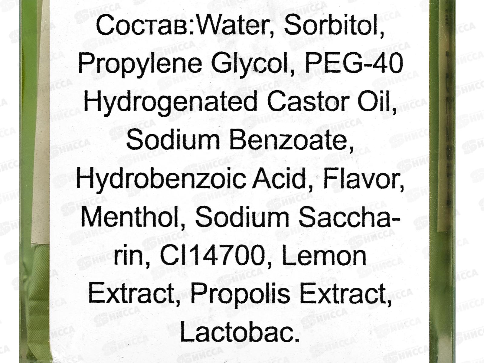Состав: вода, сорбитол, пропиленгликоль, PEG-40, гидрогенизированное касторовое масло, содиум бензоат, пара?гидроксибензойная кислота, ароматизатор, ментол, сахаринат натрия, CL14700, экстракт лайма, экстракт прополиса, лактобактерии.