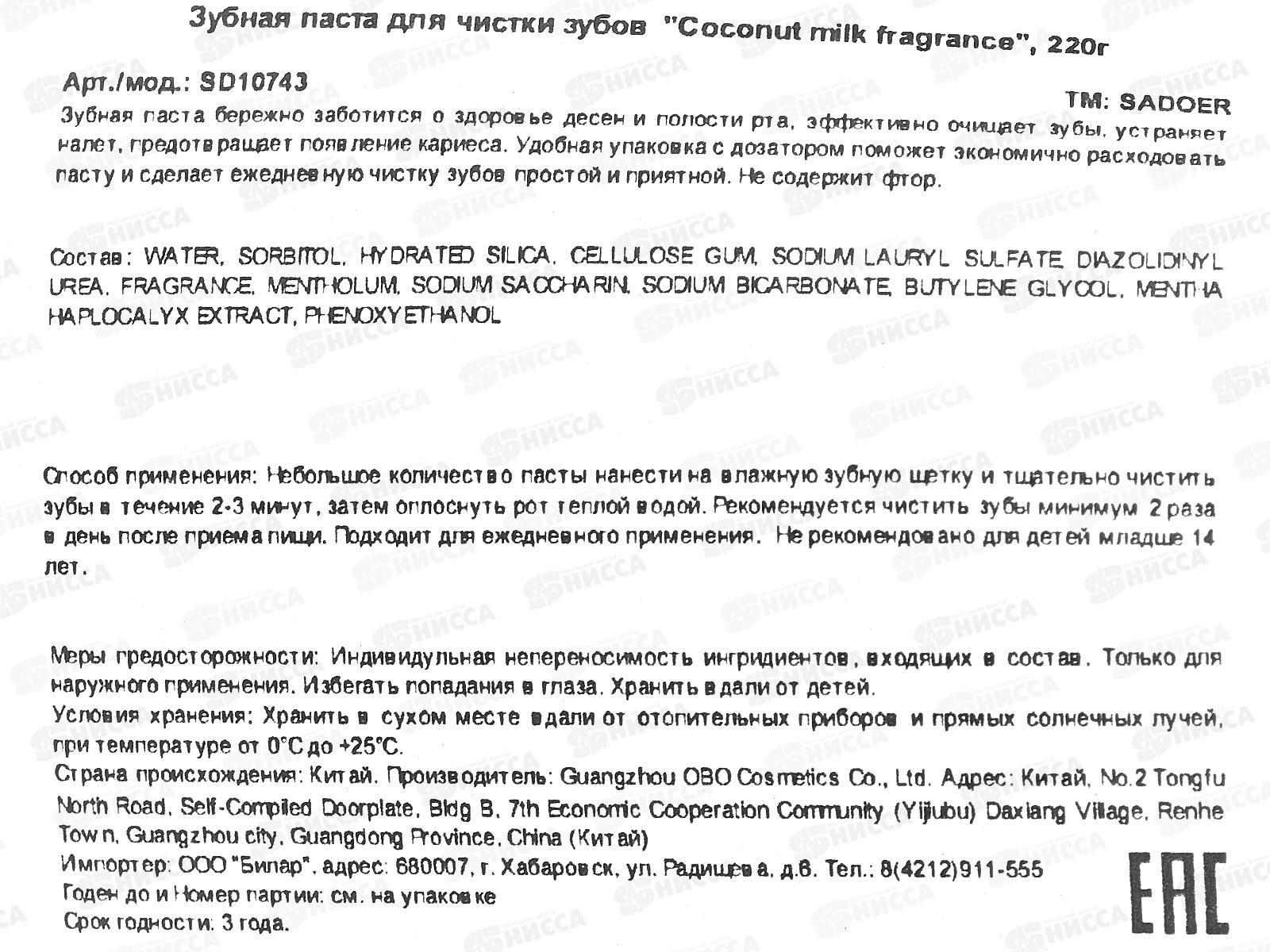 OBO Sadoer паста зубная Coconut milk fragrance доз 220гр *72