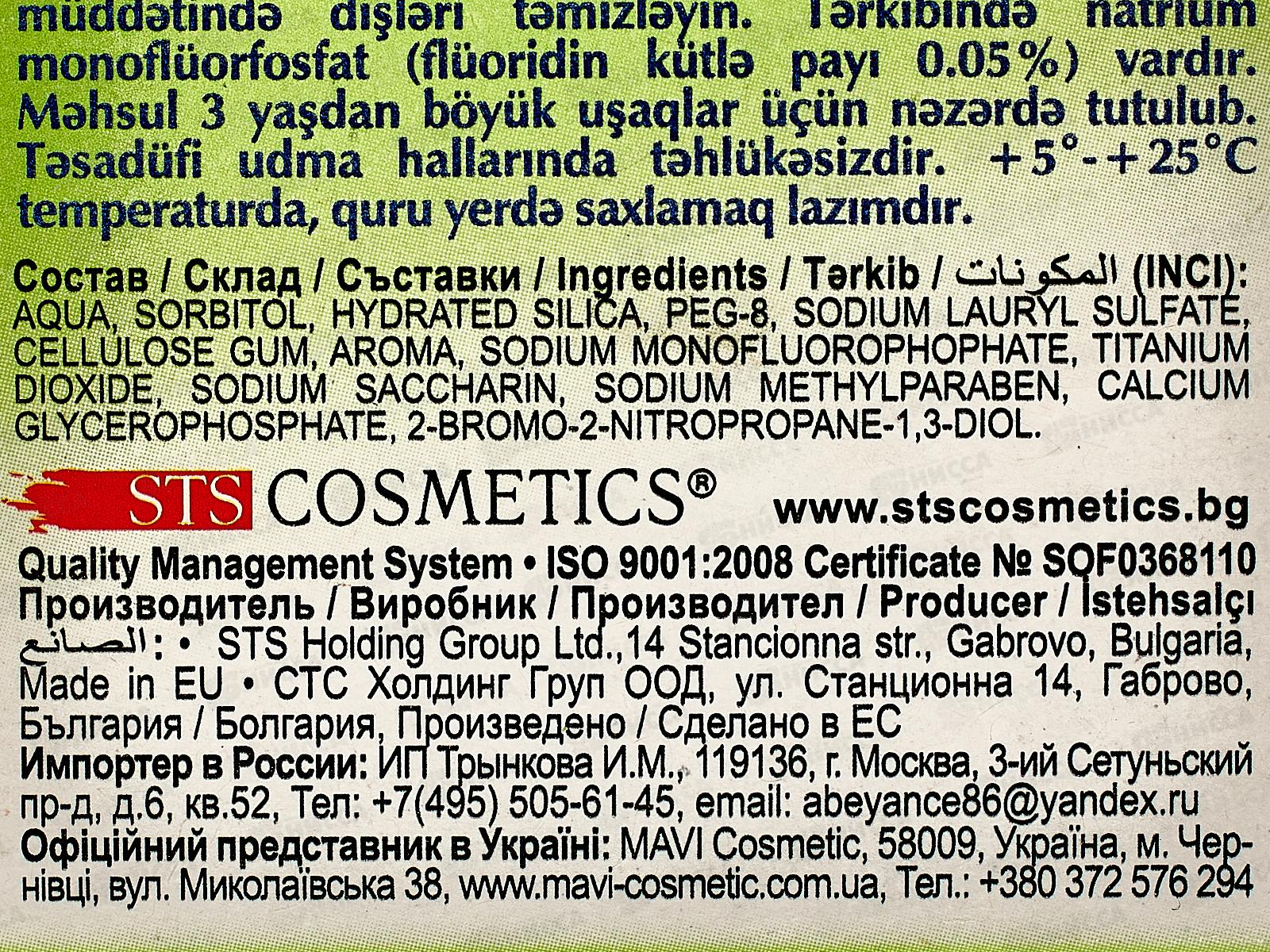 Паста предназначена для детей от 3 лет. Содержит 0,05% монофторфосфата натрия, позволяющего снизить риск появления кариеса, укрепить поверхность эмали и повысить устойчивость к воздействию кислот, которые вырабатывают вредоносные микроорганизмы. Безопасна при проглатывании. Имеет вкус ванильного мороженого. Состав: Вода, сорбит, гидратированный диоксид кремния, ПЭГ-8, лаурилсульфат натрия, целлюлозная камедь, ароматизатор, монофторфофат натрия, сахарин натрия, метилпарабен натрия, глицерофосфат кальция, 2-бром-2-нитропропан-1,3-диол.