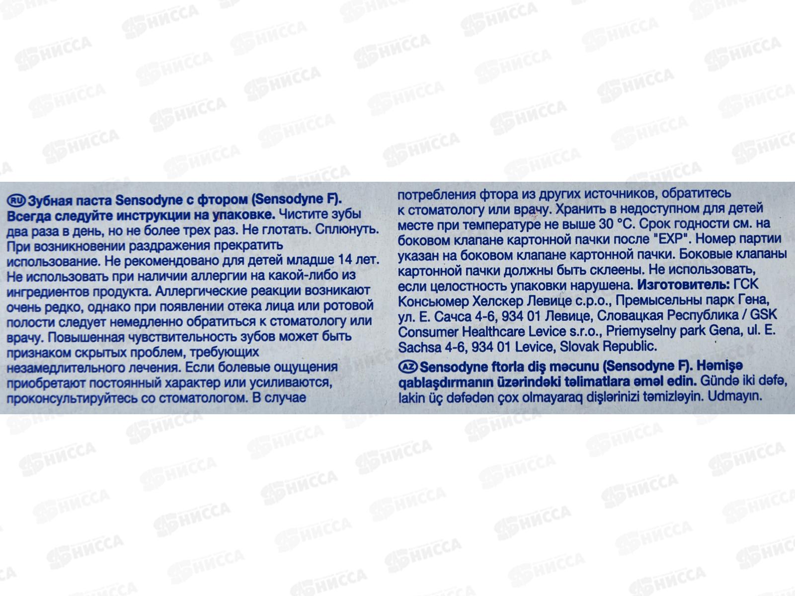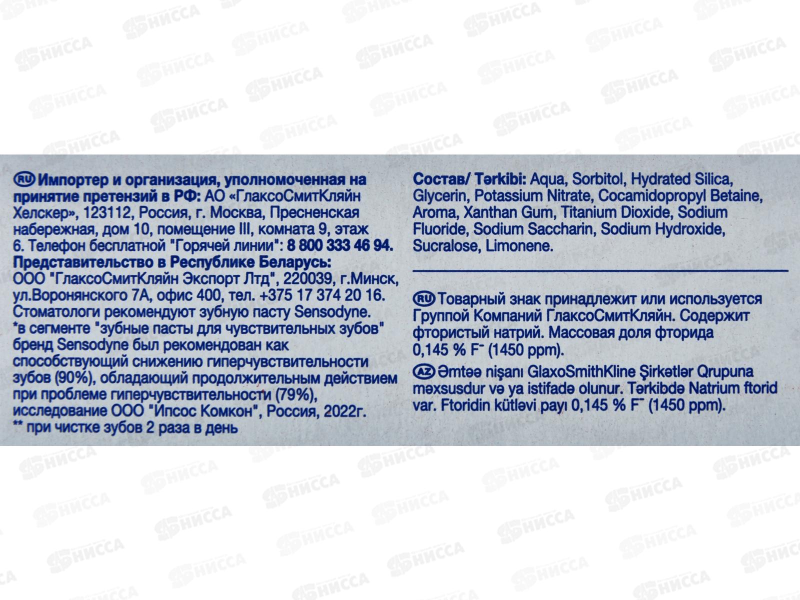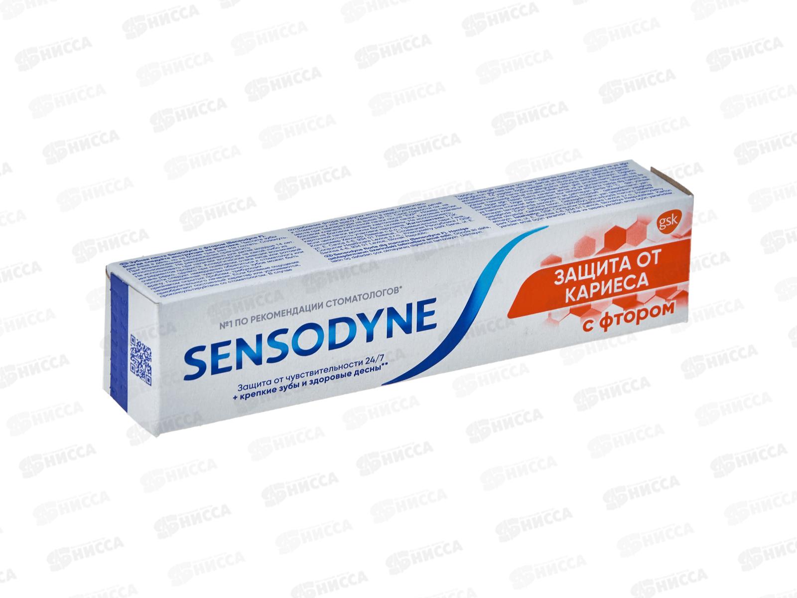 Зубная паста Sensodyne Защита от кариеса с фтором способствует уменьшению болезненные ощущения, вызванные чувствительностью зубов. Массовая доля фторида 0,145 % F? (1450 ppm). Содержит фтористый натрий. Состав: Вода, Сорбит, Гидратированный диоксид кремния, Глицерин, Нитрат калия, Ароматизатор, Ксантановая камедь, Кокамидопропилбетаин, Метилкокоилтаурат натрия, Сахарин натрия, фторид натрия, гидроксид натрия, Лимонен, CI 42090, CI 19140.