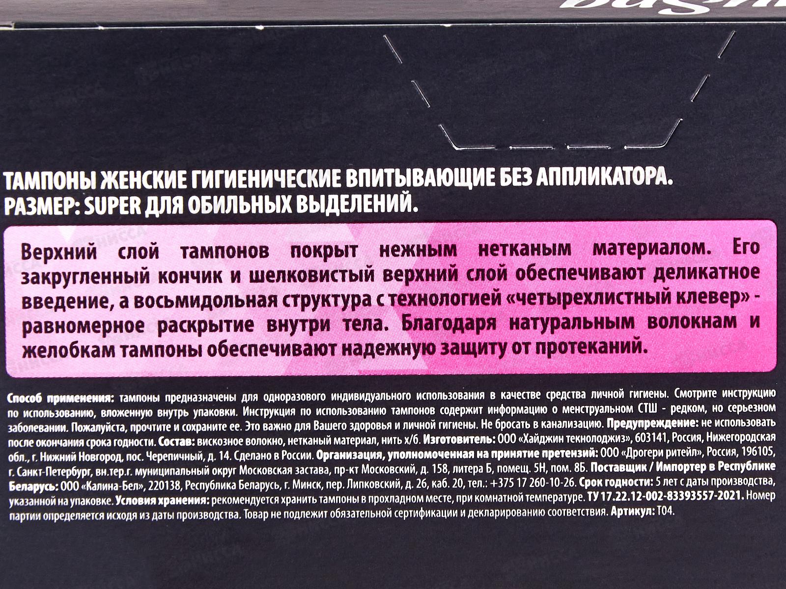 Женские гигиенические тампоны Day Spa Super обеспечивают надежную защиту и комфорт в интимной зоне при обильных выделениях. Верхний слой тампонов покрыт нежным нетканым материалом. Его закругленный кончик и шелковистый верхний слой обеспечивают деликатное введение, а восьмидольная структура с технологией «четырехлистный клевер» - равномерное раскрытие внутри тела. Благодаря натуральным волокнам и желобкам тампоны обеспечивают надежную защиту от протеканий. Тампоны без аппликатора. Состав: вискозное волокно, нетканый материал, нить х/б.
