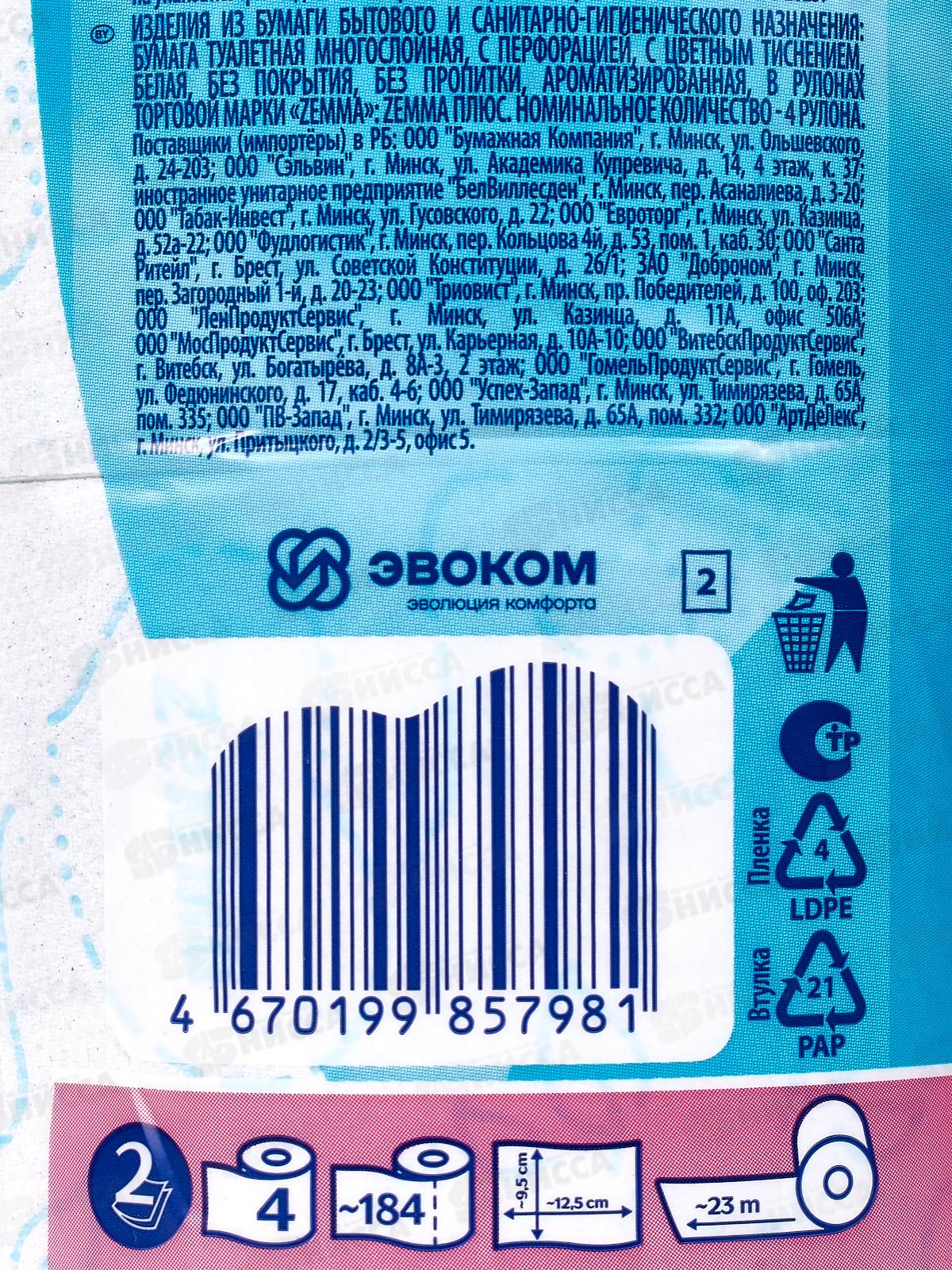 Бум. туалет. ЗЕВА+(Zemma) 2-х сл. С аром океанической свежести уп4 *24